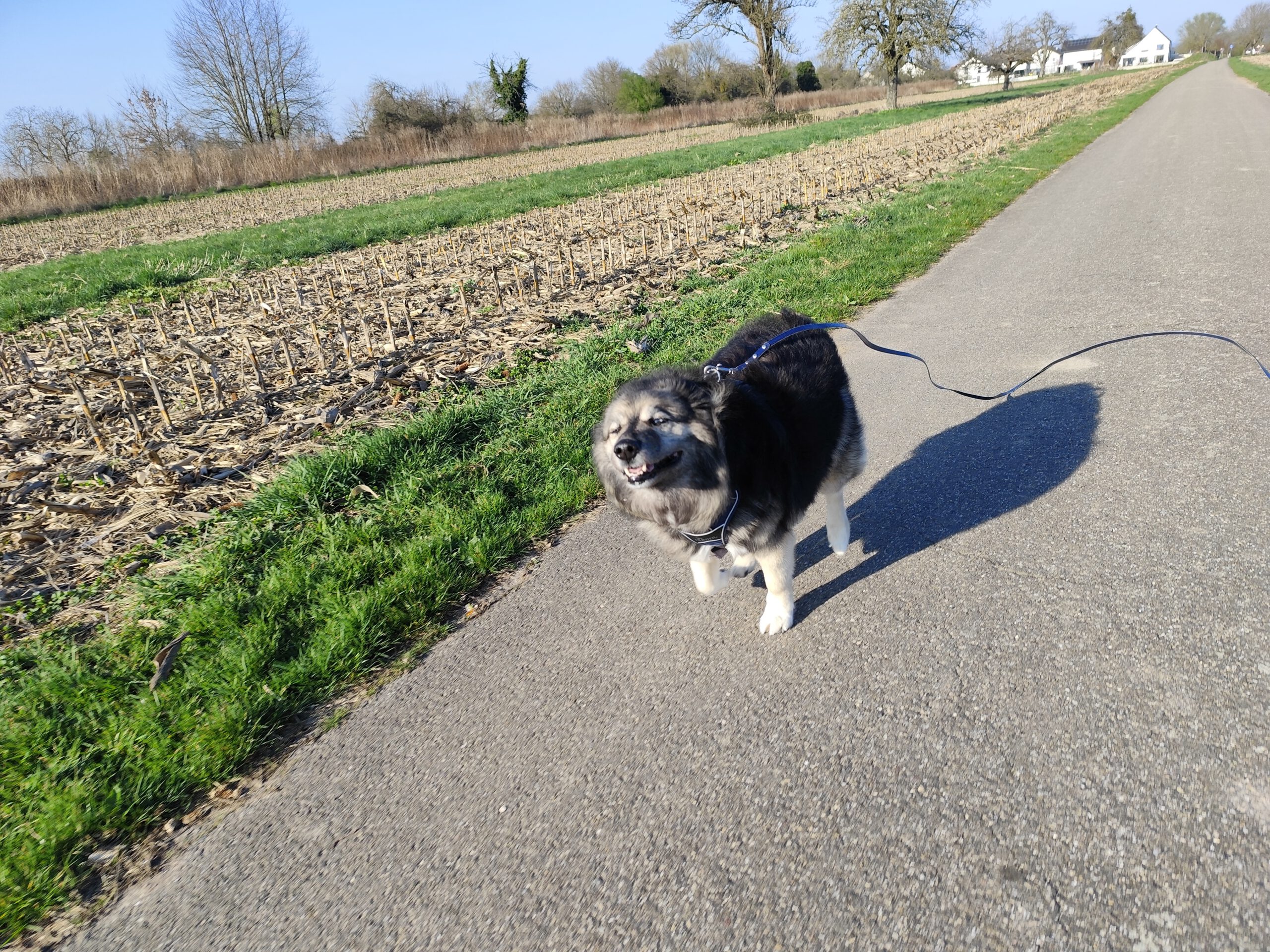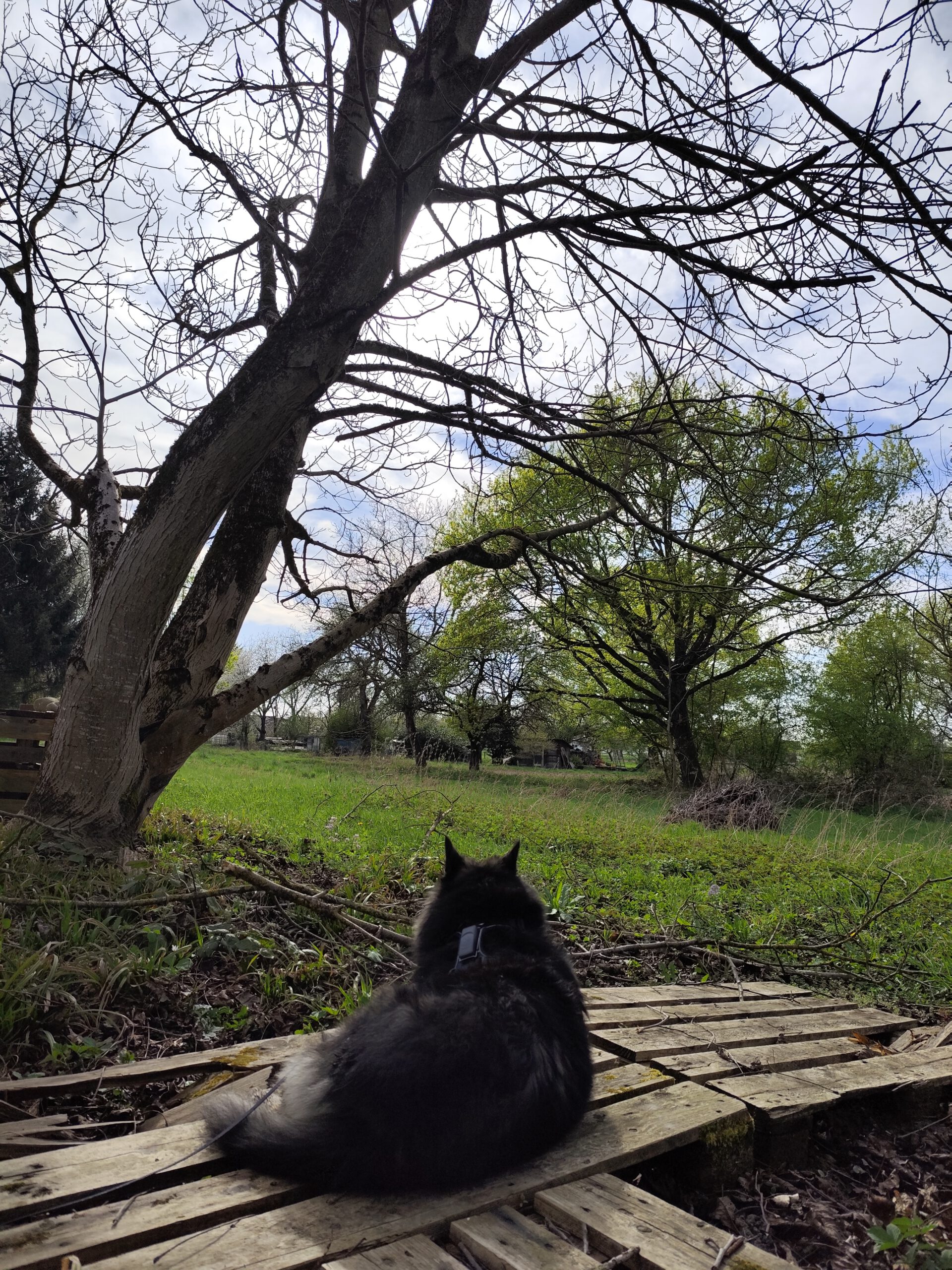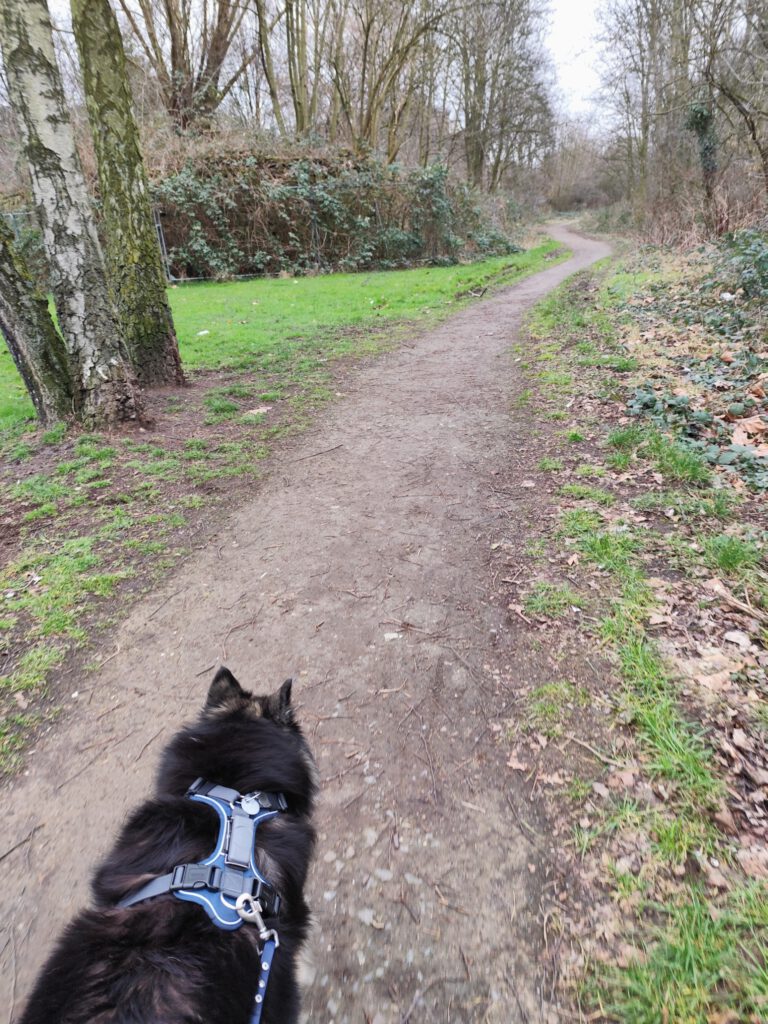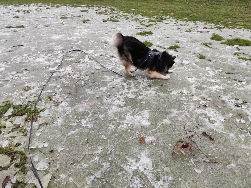 Die Temperaturen machen das Reisen, im Sinne von draußen die Natur genießen, noch unmöglich. Ein frostiger und recht trockener Winter, vom Schnee jedoch keine Spur. Das hält mich aber nicht davon ab, draußen das Vergnügen zu finden. Die Wiese, die dank der Senke oft oberflächlich Wasser trägt und dann gefriert, lädt wieder zum Herumtollen ein. Es ist ein herrliches Gefühl, wenn das Eis unter meinen Pfoten knackt und ich nach Anlauf ein paar Meter rutsche. So sind die Gassi Runden zugleich abwechslungsreicher.