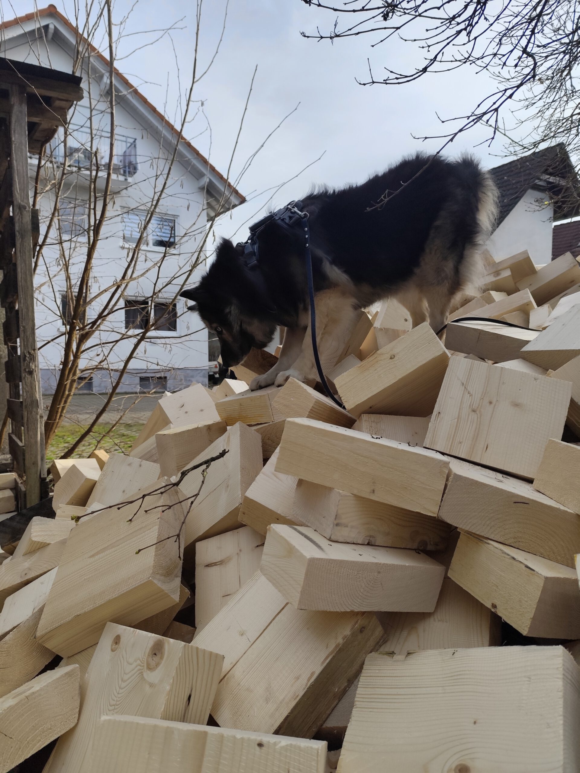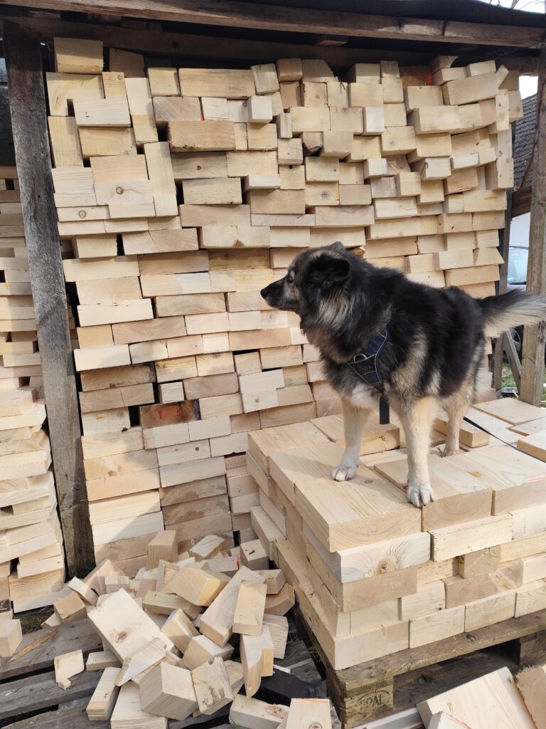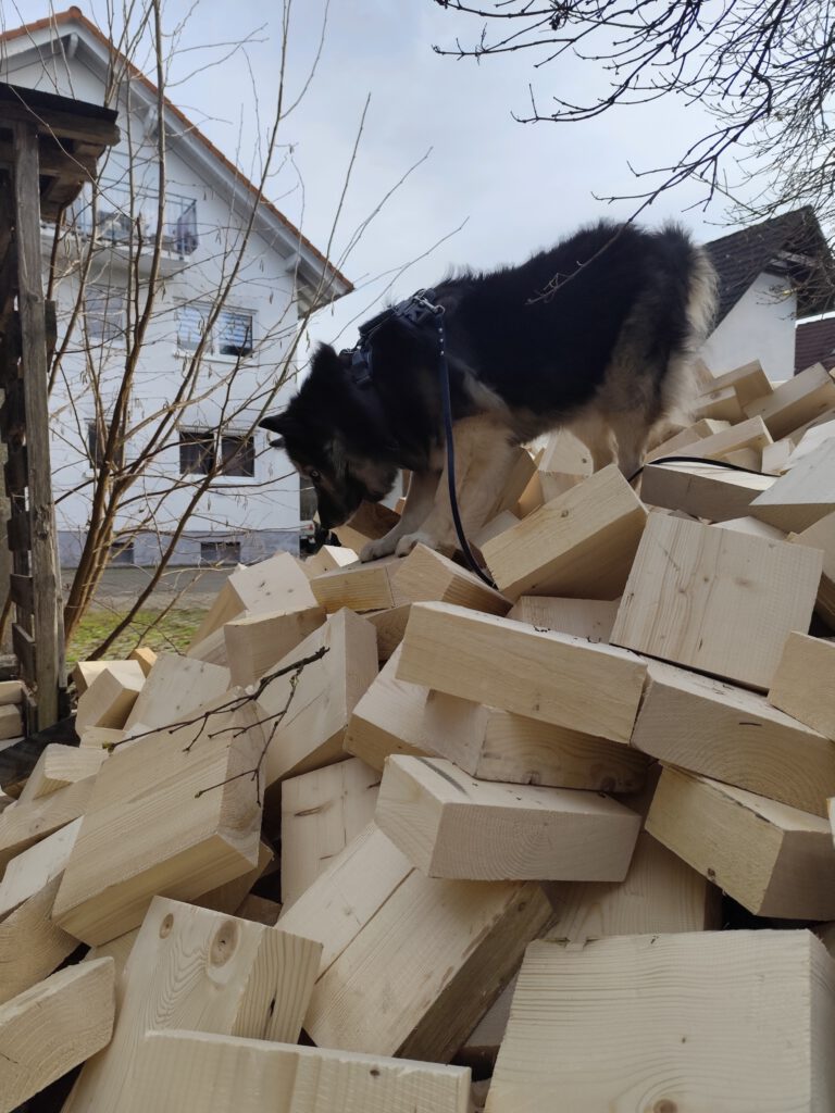 die Holzklötze einzuräumen, hüpfe ich fröhlich darauf herum. Mittendrin, statt dabei, so sagt man doch. Das Balancieren auf dem Stapel ist eine sehr wackelige Angelegenheit, aber es macht Spaß und duftet so schön nach Wald.