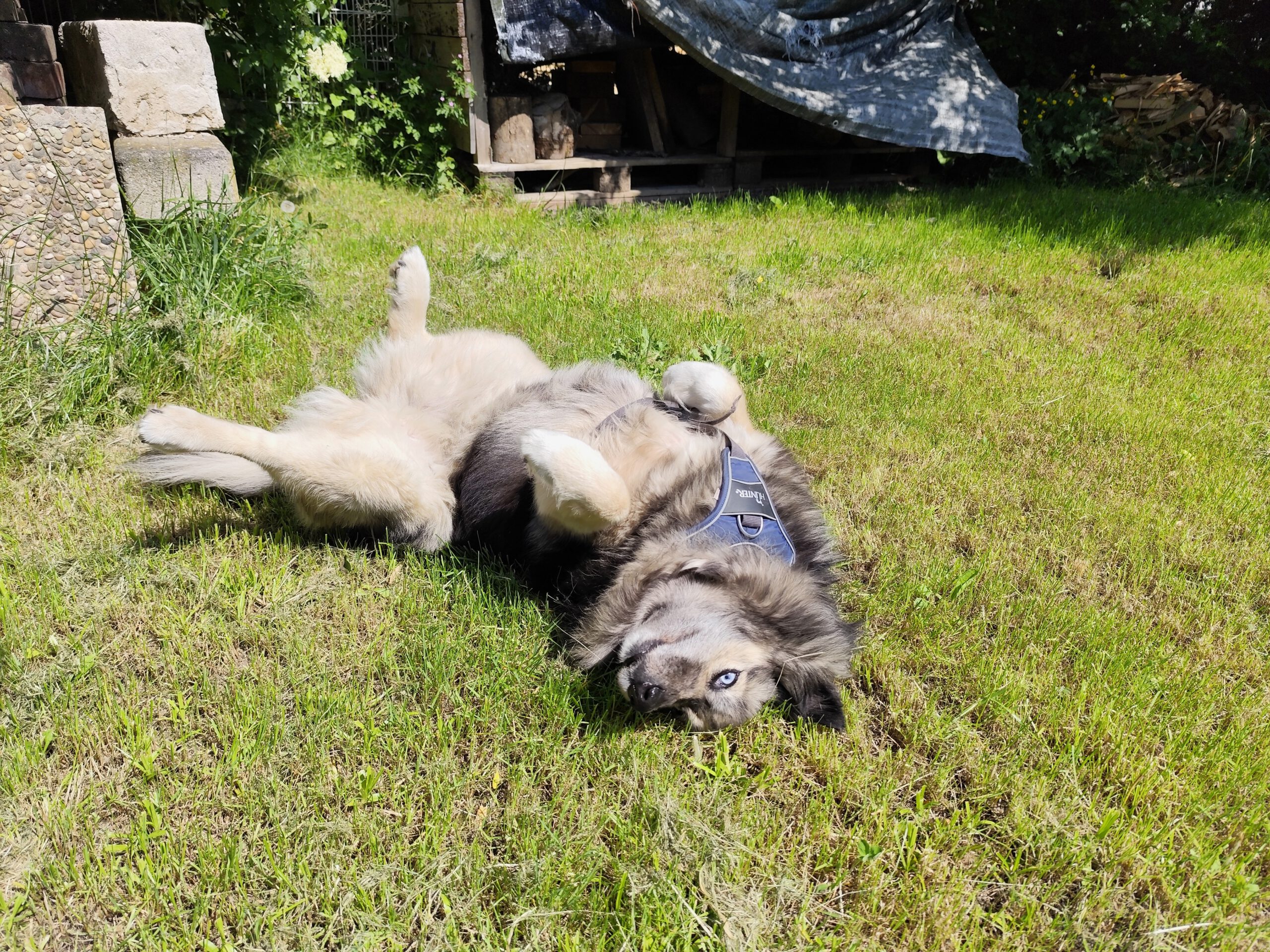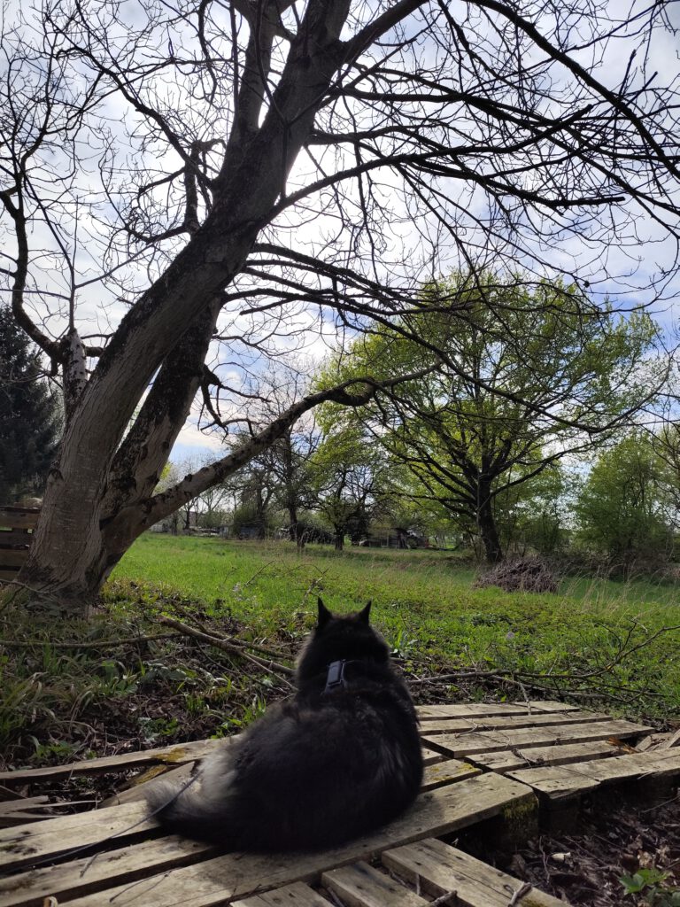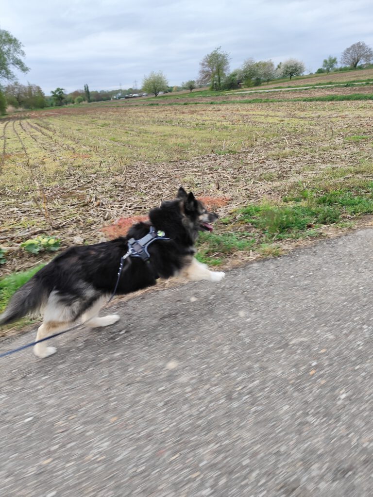 Bis dahin nutzen wir jeden trockenen Tag, um draußen spazieren zu gehen oder im Garten zu wuseln. Meine Leute sind fleißig, während ich einfach die Natur genieße. So schön, wenn am blauen Himmel die Wolken ziehen und der frische Frühlingswind nach Blumen duftet. Dabei alle viere von sich strecken und räkeln bis das Hunde-Yoga perfekt aussieht. So bin ich bestens vorbereitet für die Inliner
