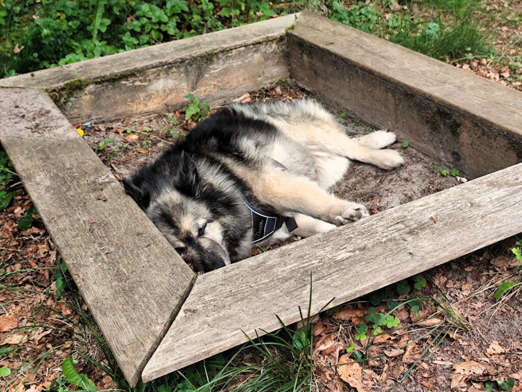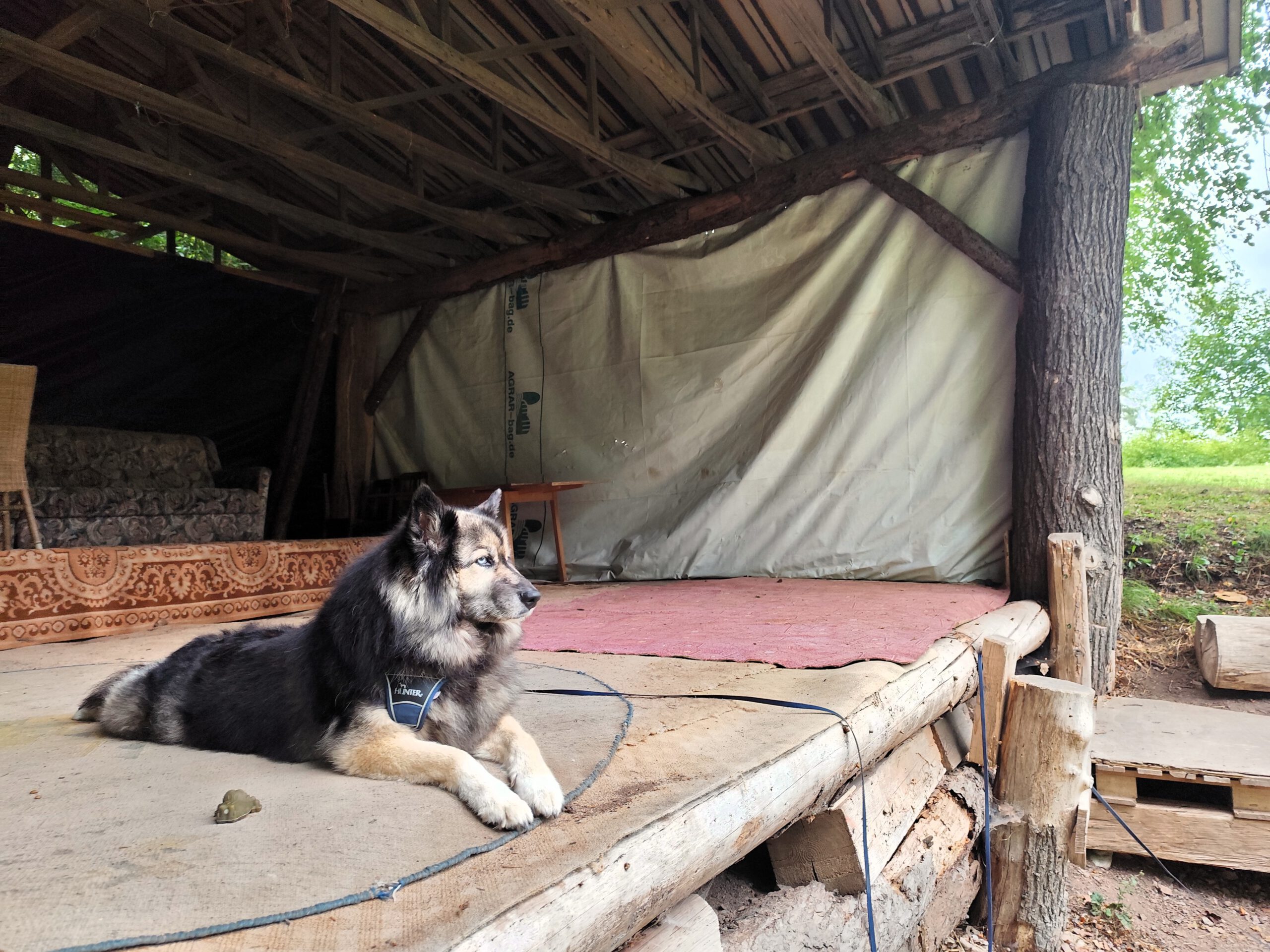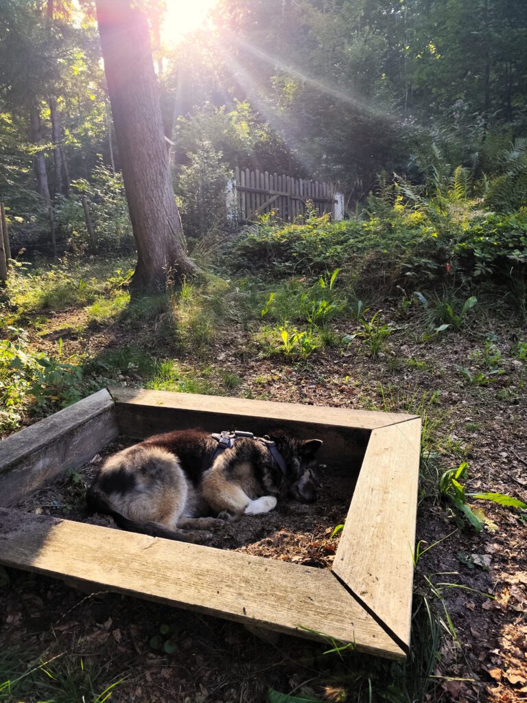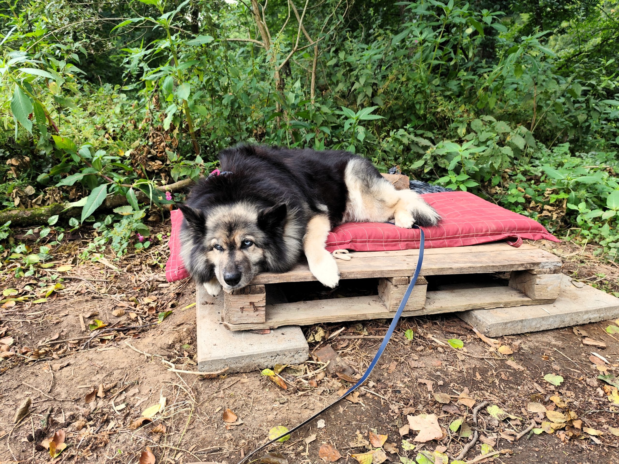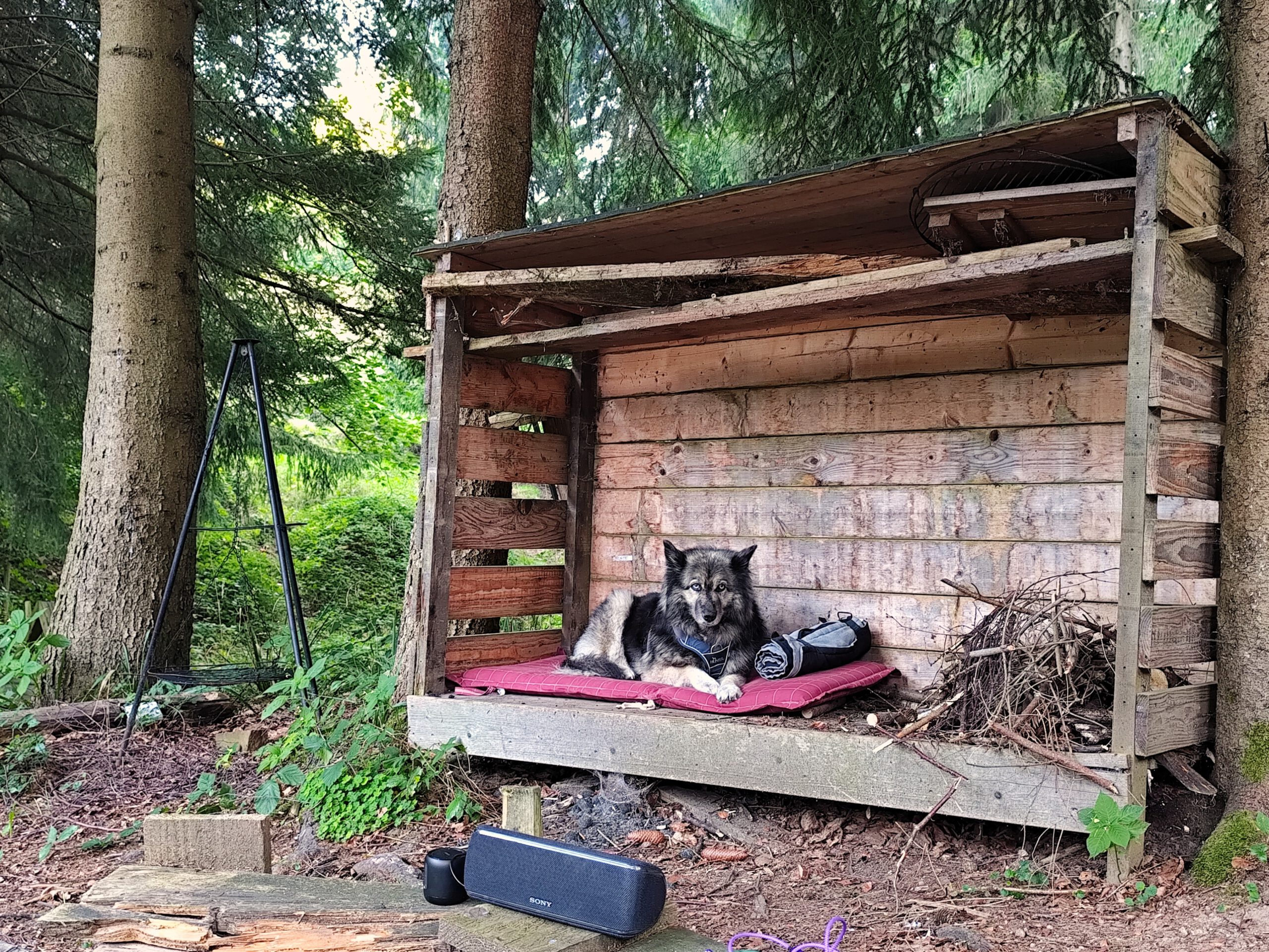 In aller Frühe beobachte ich im Garten die Aktivitäten. Das Gepäck im Caddy wird umgeräumt, Herrchen arbeitet und redet von Arbeit im Wald. Ich bin dabei, der Plan vom Forest Office klingt genial, los geht’s! Das Camp in Bad Herrenalb begeistert uns alle – eine Hütte mitten im Wald, Stein-Stufen führen hinab zum Gaisbach, der sich durch das Gelände schlängelt, ein Lagerfeuerplatz mit Holz-Bänken, dazu ein Sandkasten. Das ist mein Platz! Da wir ohne Nutzung der Hütte gebucht haben, ist kurzerhand das Tipi aufgebaut. Beim Erkunden des Geländes entdecken wir einen Ameisenhaufen und ein Fuchs kreuzt unseren Weg. In der Ferne hören wir die Huskys heulen, die hier öfters Touren machen. Nach einem sehr ausgiebigen Mahl, heute scheint mein Fresstag zu sein, verbringen wir den Abend am Lagerfeuer. Die Fledermäuse tanzen im Sternenlicht, der Himmel funkelt magisch.