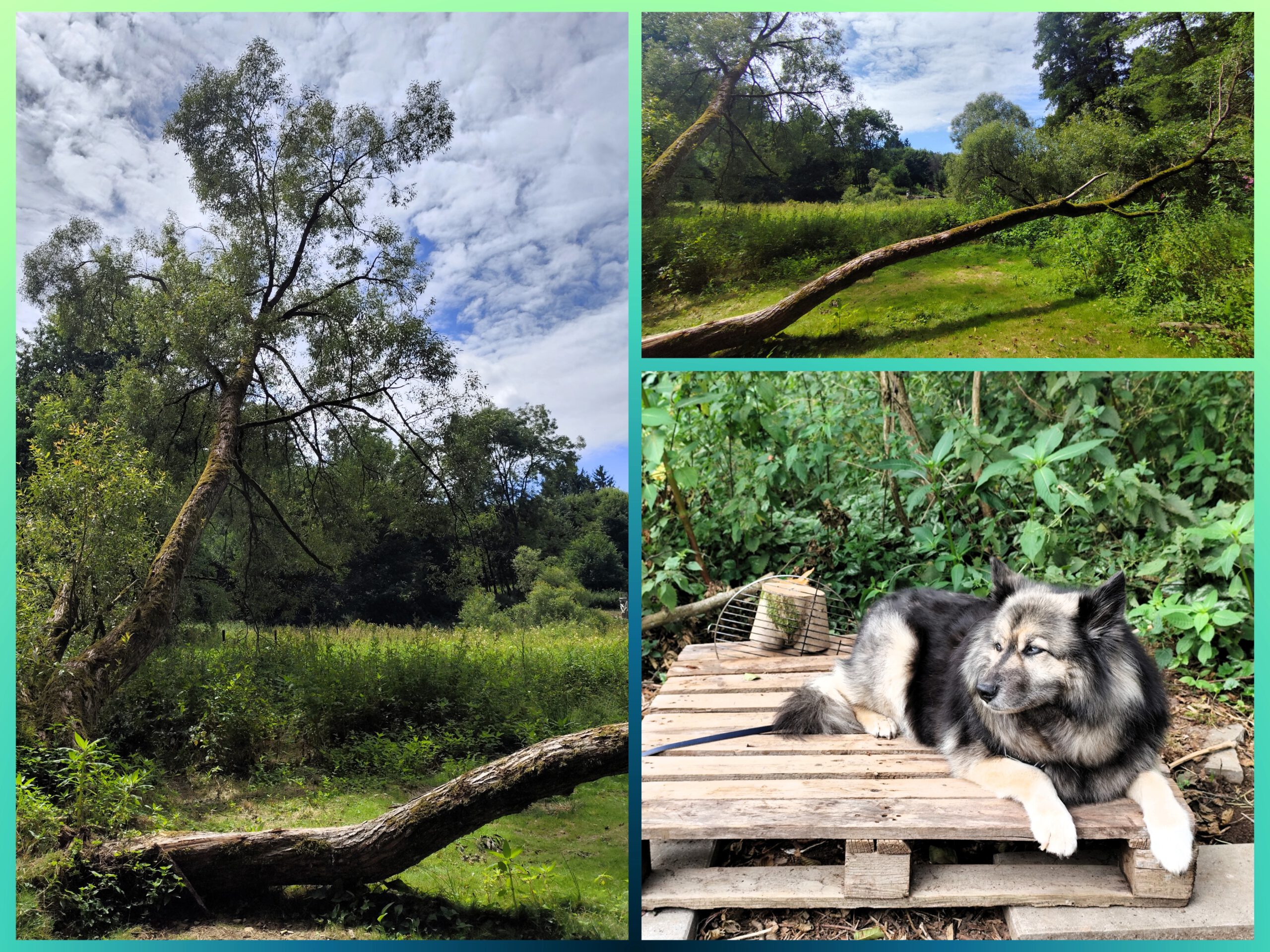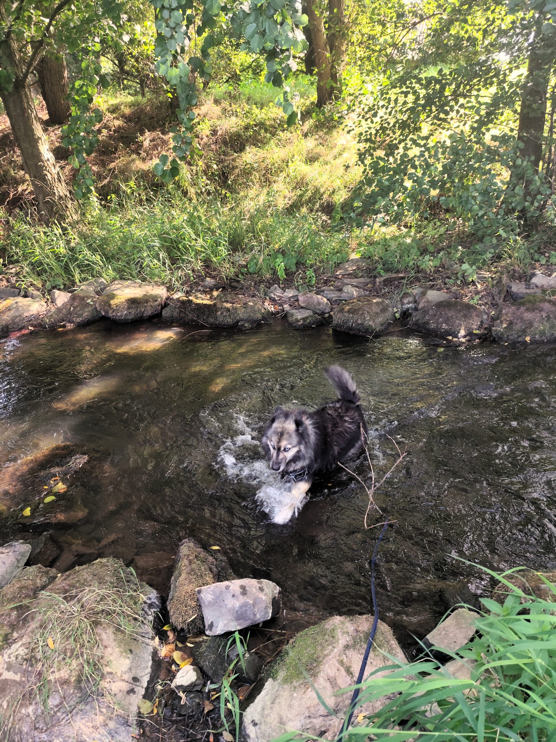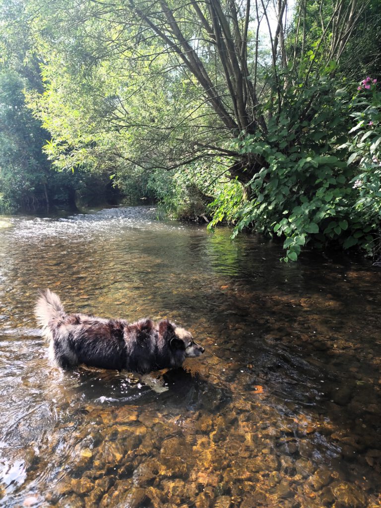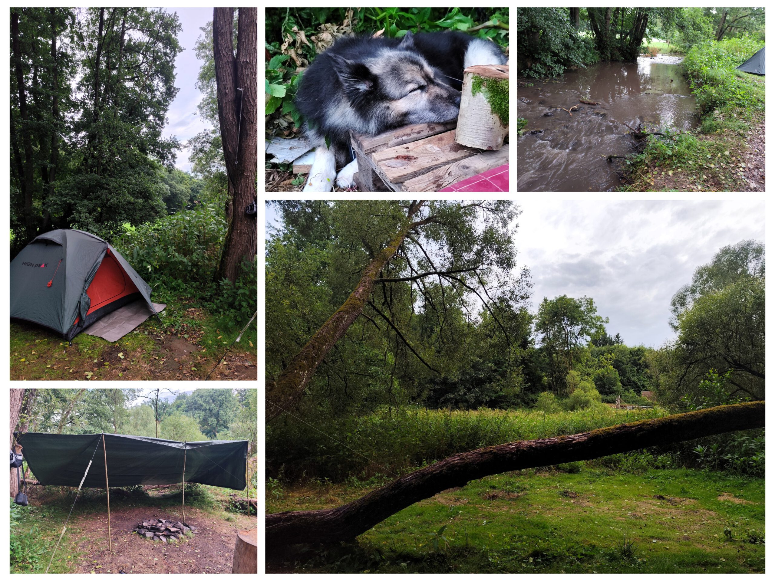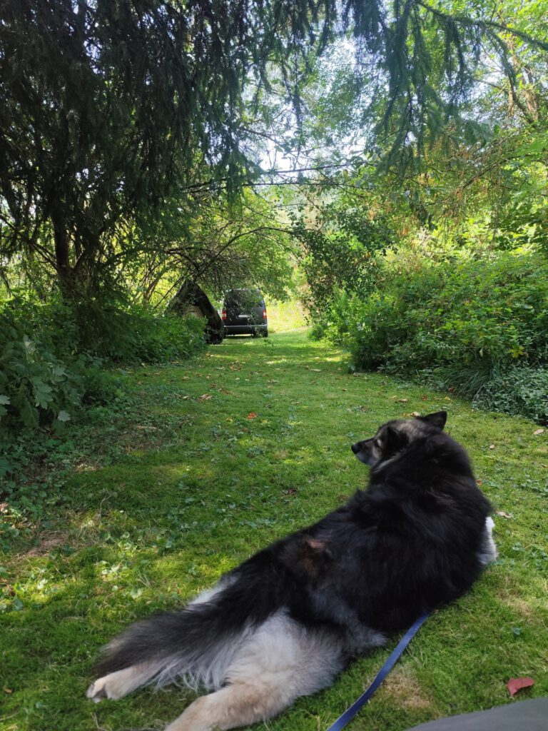 Oha, die Reise geht weiter – auf Wiedersehen Moseltal! Eine kurze Gassi Runde in der Eifel, die Currywurst Pommes Stärkung am Nürburgring für meine Leute und schwupps, trägt die Fähre uns über den Rhein von Bad Breisig nach Bad Hönningen. Kurze Zeit später ein kurzer Halt im Wald, der Himmel verdunkelt sich. Prompt bricht ein Unwetter los, ab ins Auto, das mag ich ja gar nicht, wenn es kracht und blitzt, dazu regnet es in Strömen. Selbst meine Leute scheinen auch etwas besorgt zu sein, vorsichtig fahren wir weiter bis Kurtscheid, bloß weg von der Landstraße im Wald. Wir harren aus bis die dunkle Front vorbeigezogen ist und reisen zum Camp Fuchsmühle im Westerwald. Damit hätte ich nicht gerechnet, dass wir wie letztes Jahr an diesem schönen Zeltplatz am Kleinen Saynbach