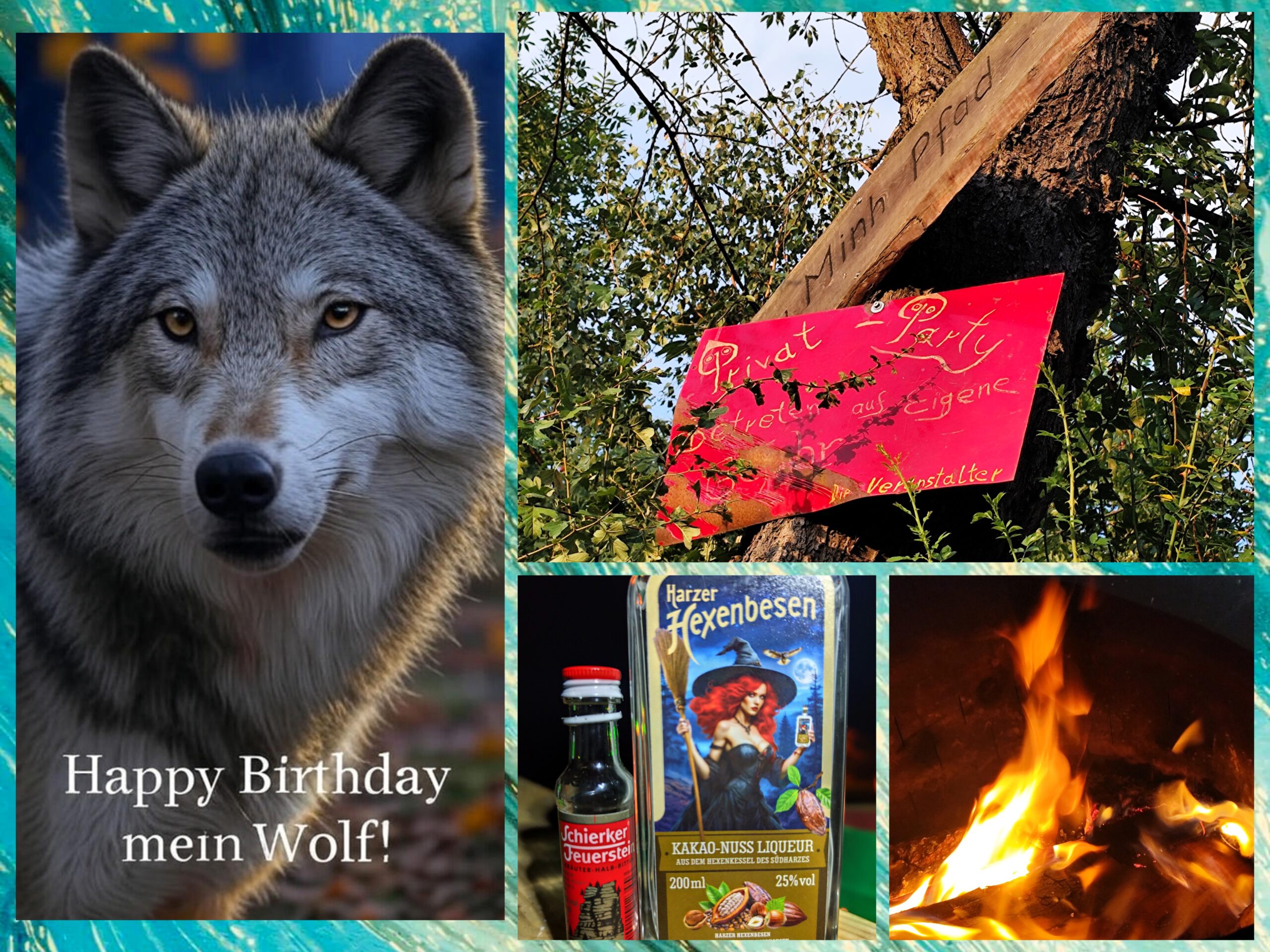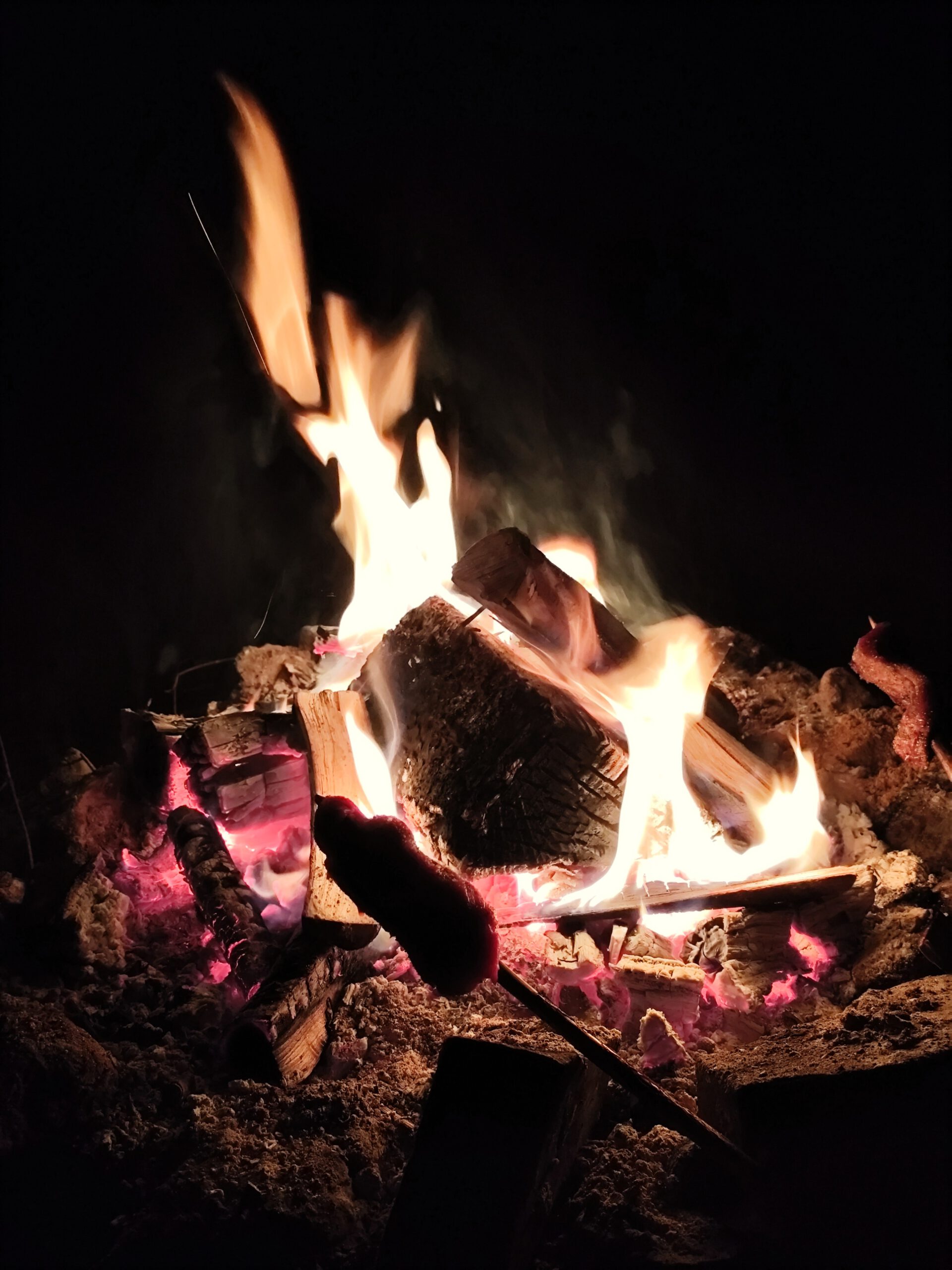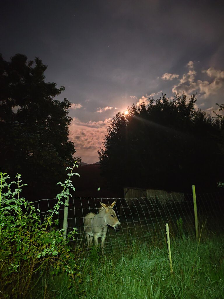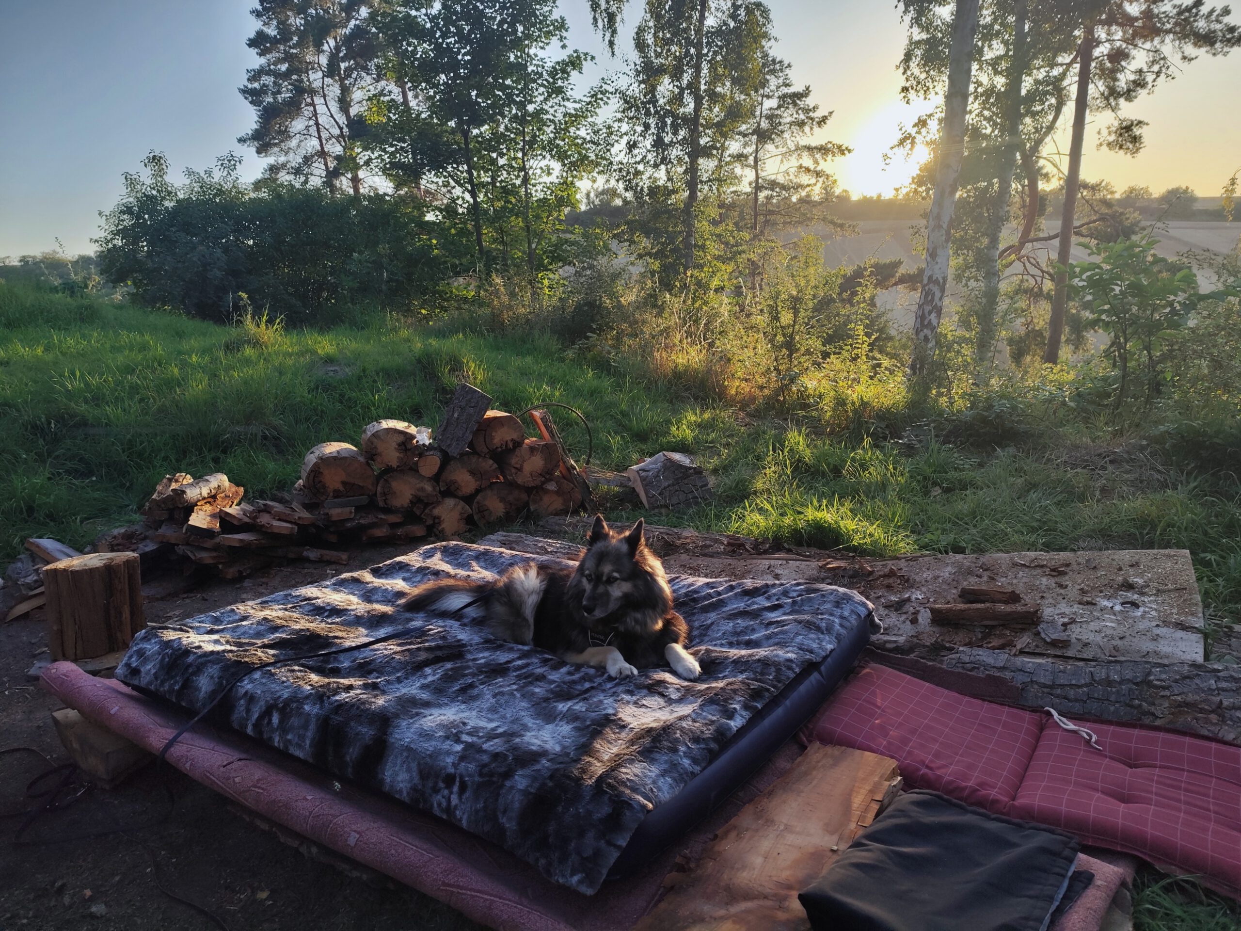 Der Sommer ist definitiv zurück! Ausnahmsweise frühstücke ich, der Schinken vom Bauernhof ist ein Gaumenschmaus. Da genug Bohlen als Feuerholz da sind, schiebt Frauchen welche zusammen, legt einen kleinen Teppich von der Bühne obenauf und zu guter Letzt unsere Ersatz-Luftmatratze – fertig ist das Sternenbett! Beim Einkauf wird auch nicht gespart, ich denke wir werden wohl hier länger verweilen. Abends feiern wir rein und stoßen zusammen an, Happy Birthday Wolf – Herrchen hat Geburtstag! Spät in der Nacht schauen wir uns bequem den Sternenhimmel an, es wird tatsächlich frisch, mit Decke ist es aber okay. Als der Mond über dem Berg sichtbar wird, fängt es leicht an zu dämmern. Das Lagerfeuer kurz wiederbelebt, noch etwas essen und wir kuscheln uns zusammen ins Zelt.