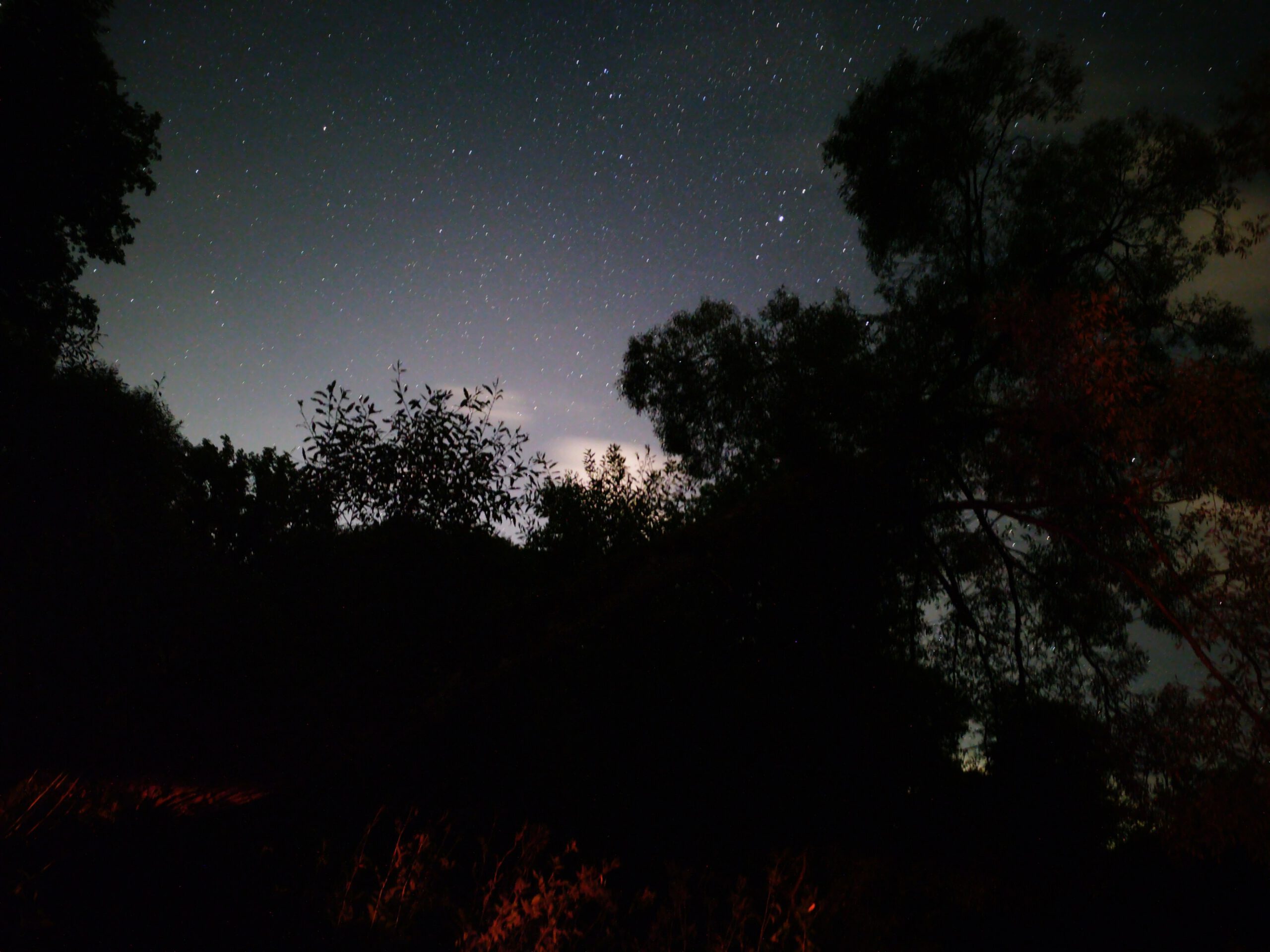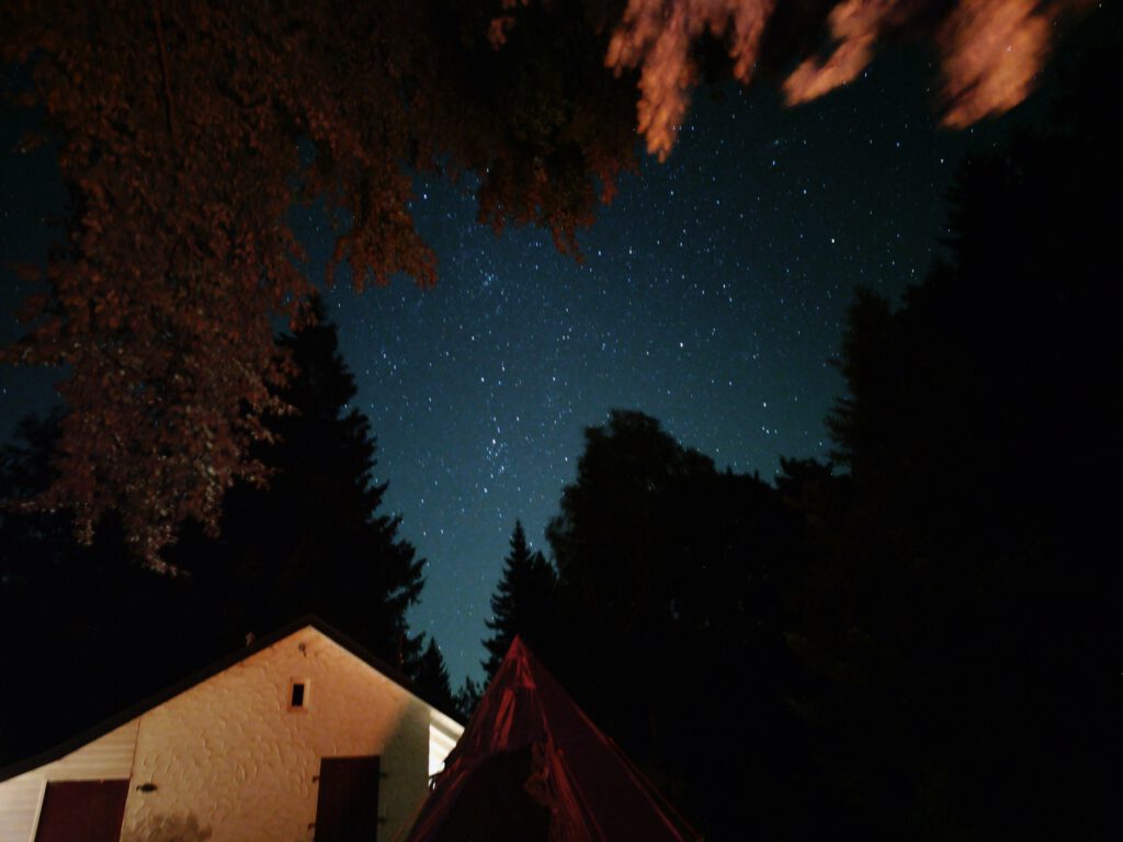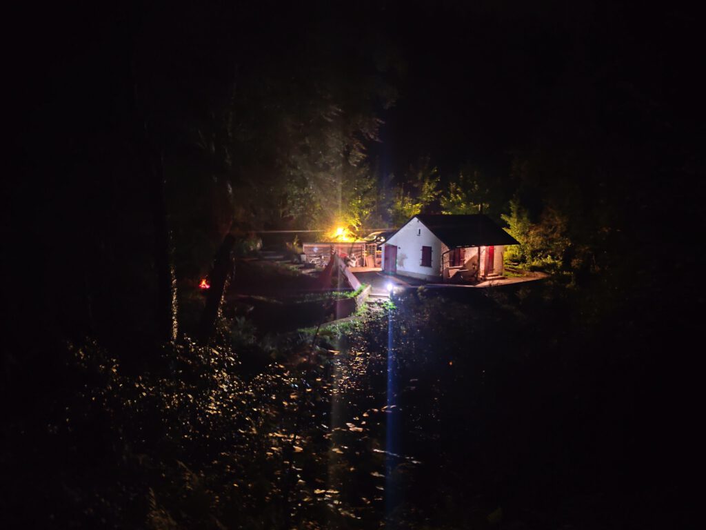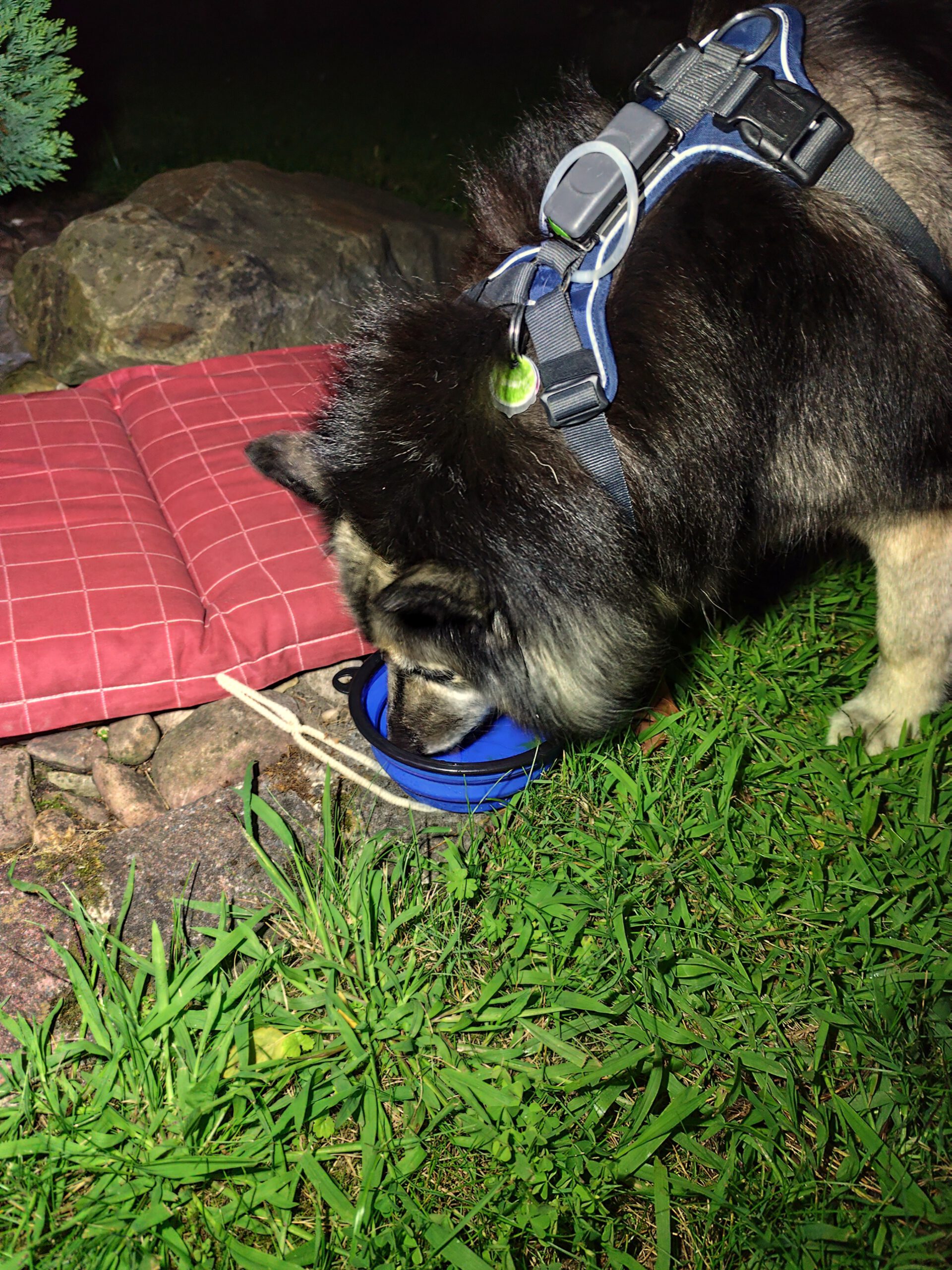 Der Sommer ist definitiv zurück! Ausnahmsweise frühstücke ich, der Schinken vom Bauernhof ist ein Gaumenschmaus. Da genug Bohlen als Feuerholz da sind, schiebt Frauchen welche zusammen, legt einen kleinen Teppich von der Bühne obenauf und zu guter Letzt unsere Ersatz-Luftmatratze – fertig ist das Sternenbett! Beim Einkauf wird auch nicht gespart, ich denke wir werden wohl hier länger verweilen. Abends feiern wir rein und stoßen zusammen an, Happy Birthday Wolf – Herrchen hat Geburtstag! Spät in der Nacht schauen wir uns bequem den Sternenhimmel an, es wird tatsächlich frisch, mit Decke ist es aber okay. Als der Mond über dem Berg sichtbar wird, fängt es leicht an zu dämmern. Das Lagerfeuer kurz wiederbelebt, noch etwas essen und wir kuscheln uns zusammen ins Zelt.