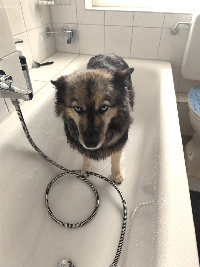 Heute ist mein Tag, auf geht’s zum Zoofachhandel. Der Piepsi Raum hört sich spannend an, aber leider dürfen Hunde nicht in den Geflügel ähm Bereich für Haustier-Vögel. Vollgepackt mit Leckereien und alsbald zurück, steckt das Frauchen mich in die Badewanne. Erst das Vergnügen, dann die Arbeit? Das frische flauschige Fell hat auch was Feines. Der restliche Tag steht ganz im Zeichen der Entspannung, selbst für meine Leute.