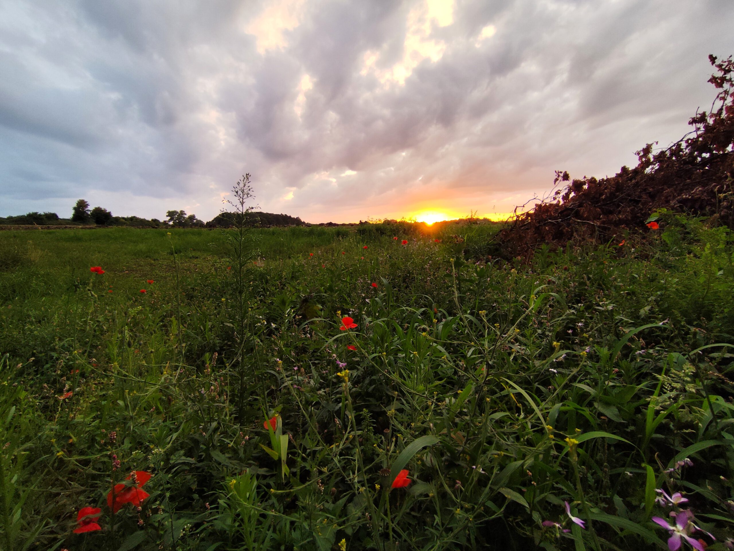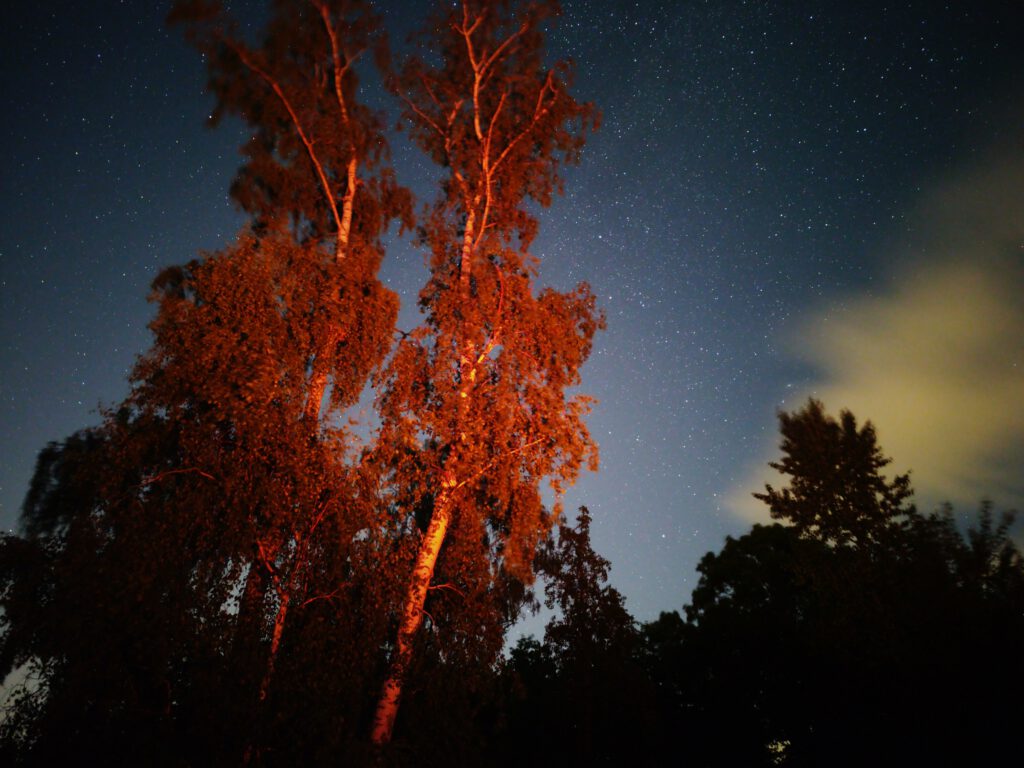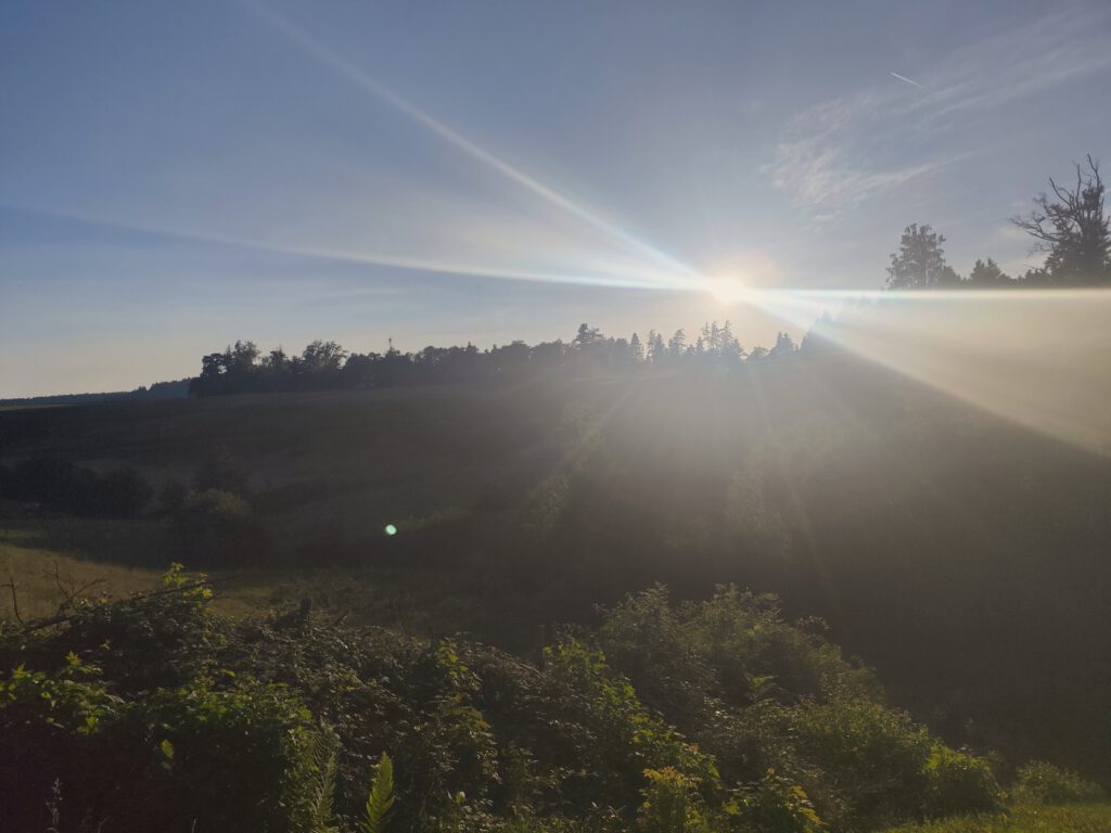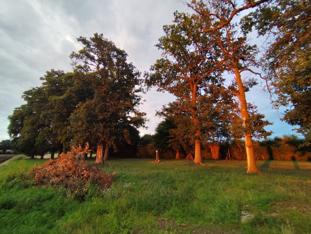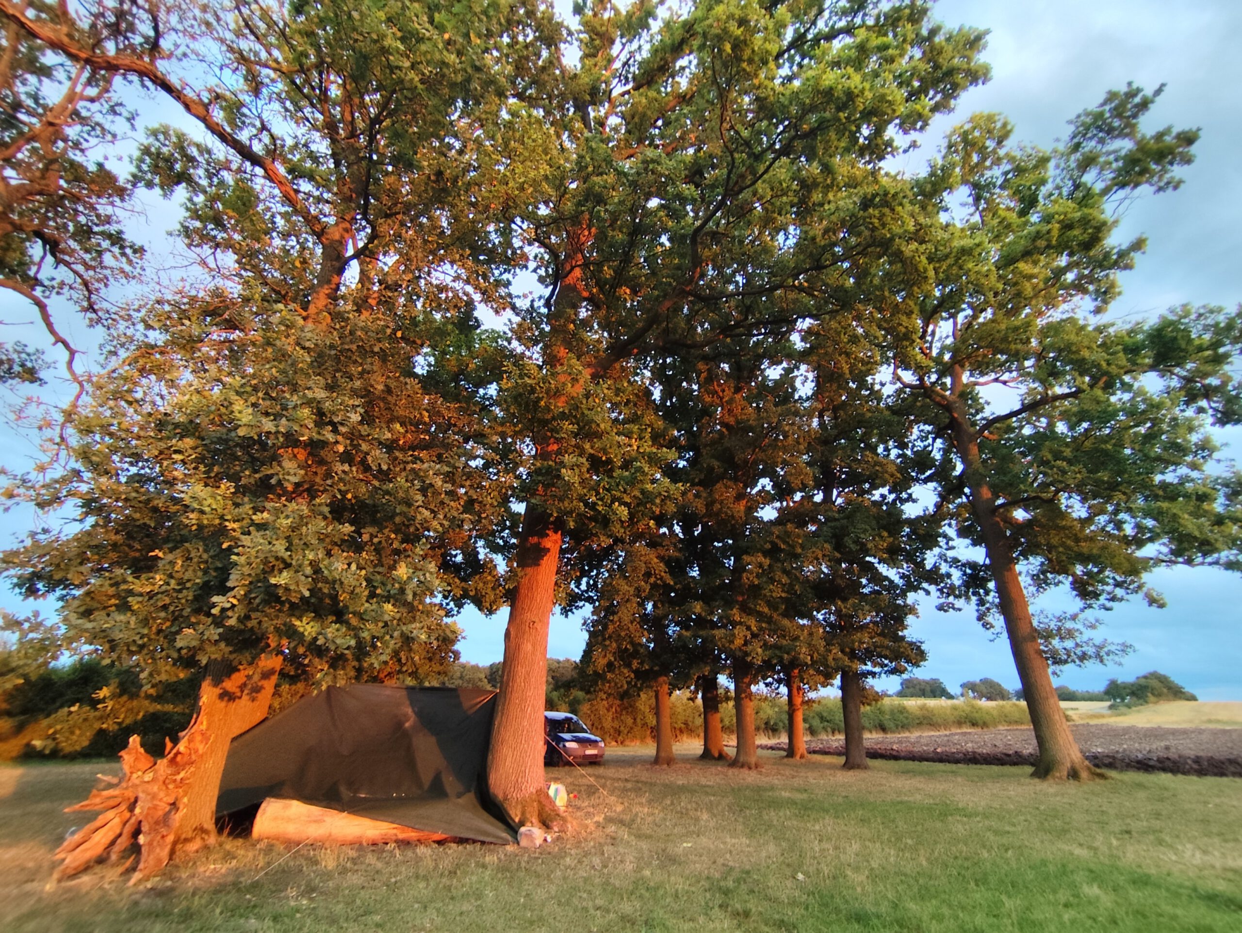 Während ich noch faulenze, wuseln meine Leute bereits. Nachmittags ist der Caddy startklar, ciao Familie, ciao Ruhrgebiet! Noch die Currywurst aus Essen einpacken, bei Gladbeck die Mettbrötchen mitnehmen, weiter Richtung Wulfen erreichen wir das Ziel Coesfeld im Münsterland. Das ist mal etwas ganz anderes, eine große Wiese unter Eichen mit Hecke als Sichtschutz und Aussicht auf weite Felder und kleine Wälder. Bei der steifen Brise hier, helfe ich meinen Leuten das Shelter zu bändigen. Es gibt zwar keinen Bach, dafür liefert die Schwengelpumpe uns kaltes Brunnenwasser. Der Abend ist etwas frisch, aber am Lagerfeuer ist es angenehm und der Ausblick auf den Sternenhimmel echt toll.