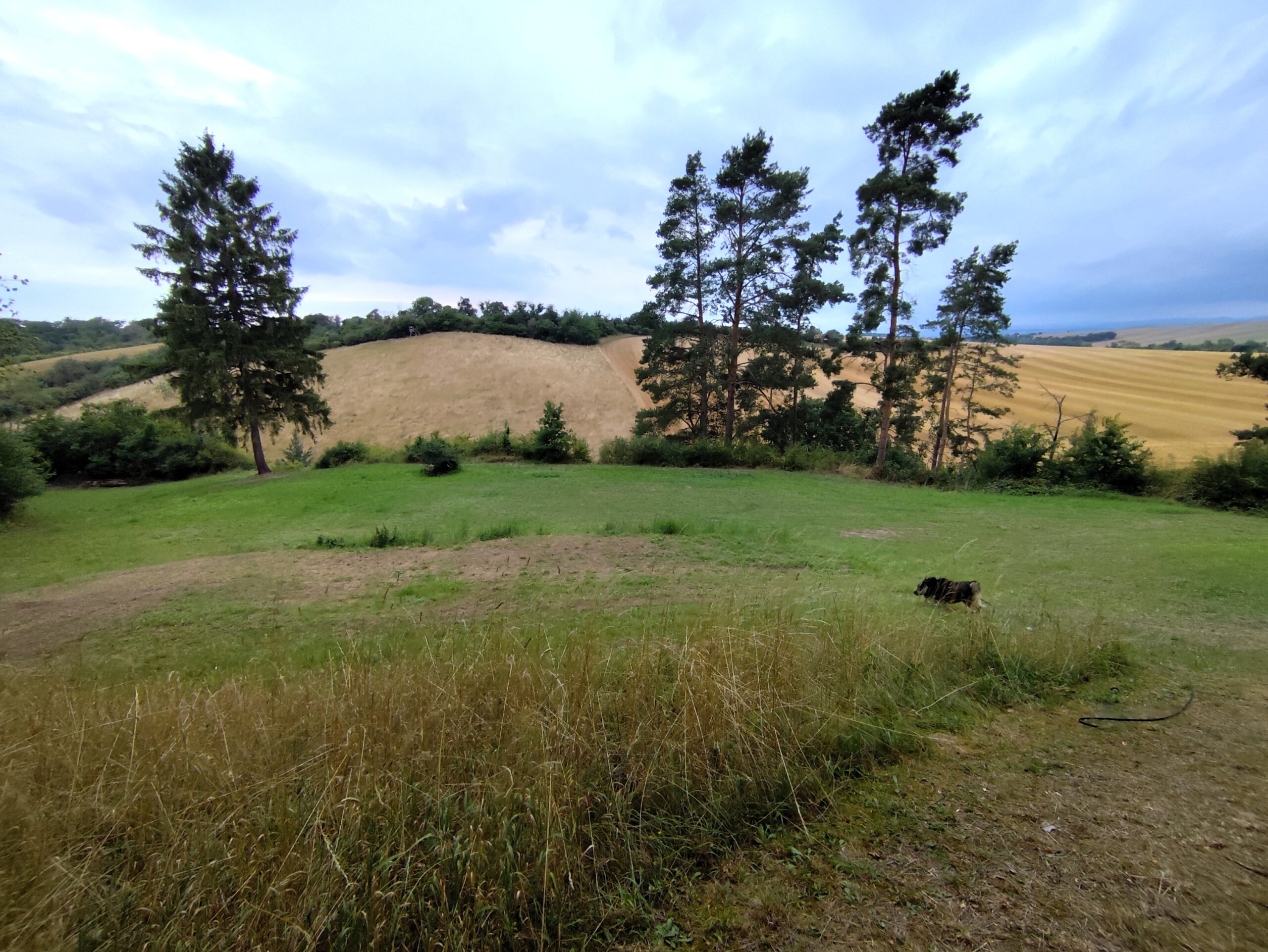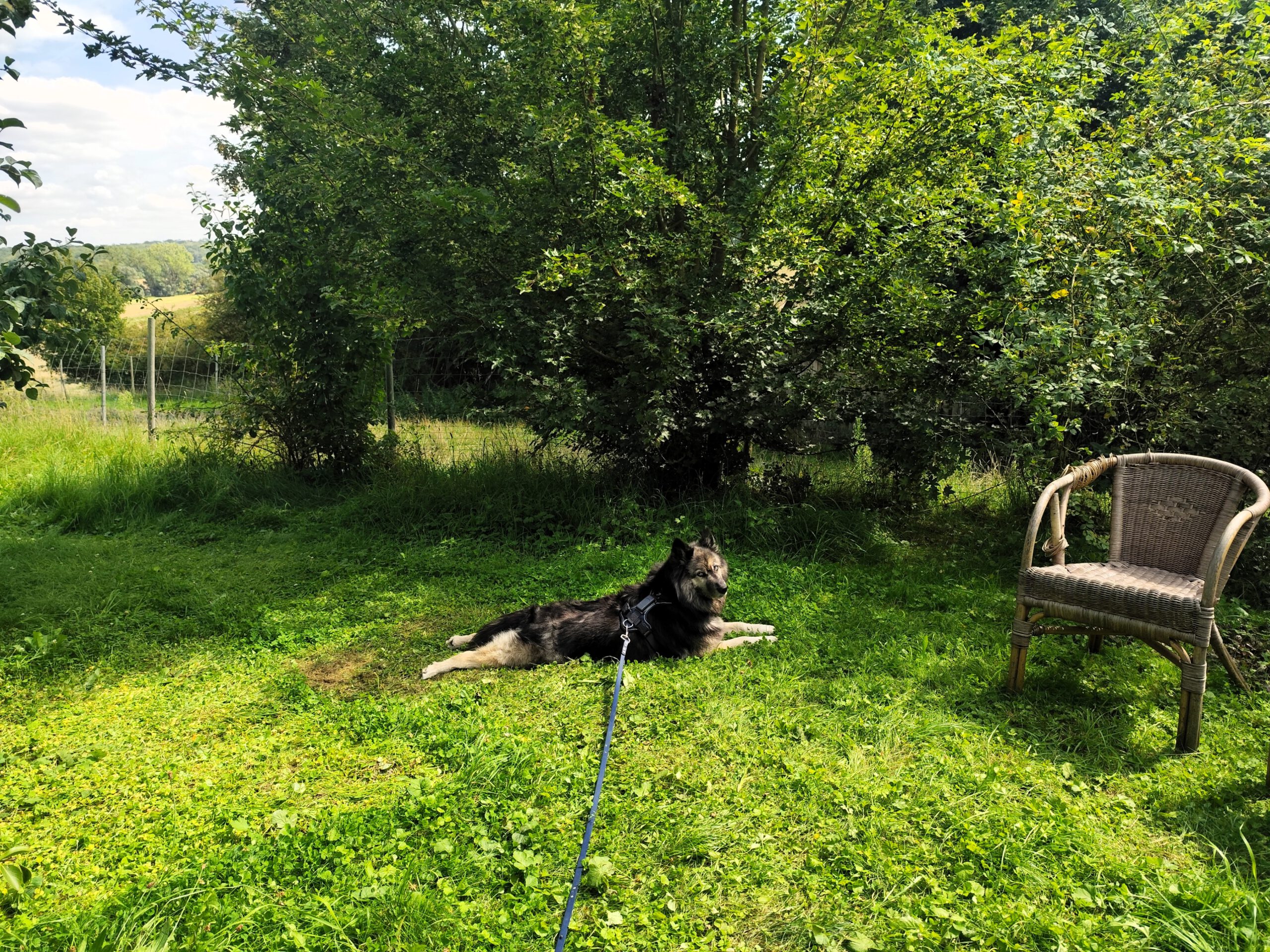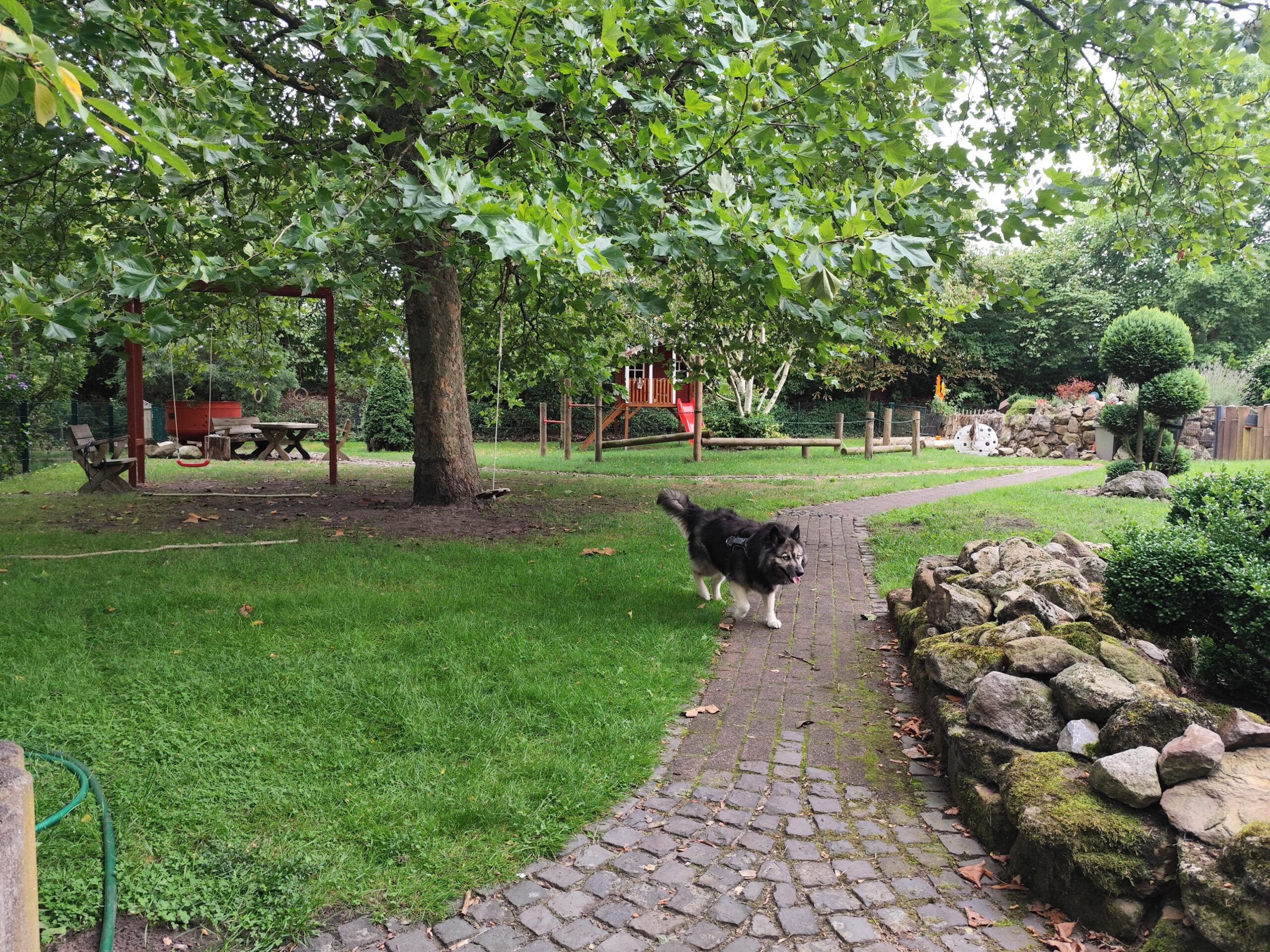 Warum auch immer es so toll ist, vormittags Hasen und Traktoren zu beobachten, vielleicht gehört das zum Urlaub dazu? Gegen Nachmittag ist es zumindest Zeit weiterzureisen. Eine Gassi Runde bei Greven, weiter über Ostbevern, verlassen wir das Münsterland und nähern uns dem Teutoburger Wald. In einer kleinen Siedlung in Versmold erreichen wir unseren nächsten Spot. Neben dem großen Gehöft, welches nun das Wohnhaus unserer Gastgeber ist, befindet sich als Drive-In ein großer Garten mit Obstbäumen und Gemüsesträuchern. Und das Beste daran? Leinenfreiheit für mich! Alles ist eingezäunt und nebenan als Bonus mein Kino – ein Gehege mit Hühnern, Wachteln, Laufenten und der Hahn kräht munter los. Die frischen Eier genießen wir auf jeden Fall – welch ein Genuss! Ein kurzer Einkauf für den Grillabend und ich bekomme ein Hundebier sowie Feta Käse.