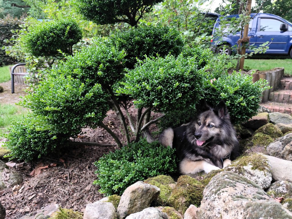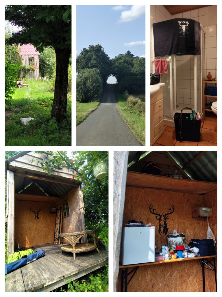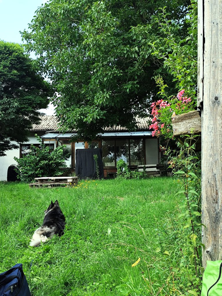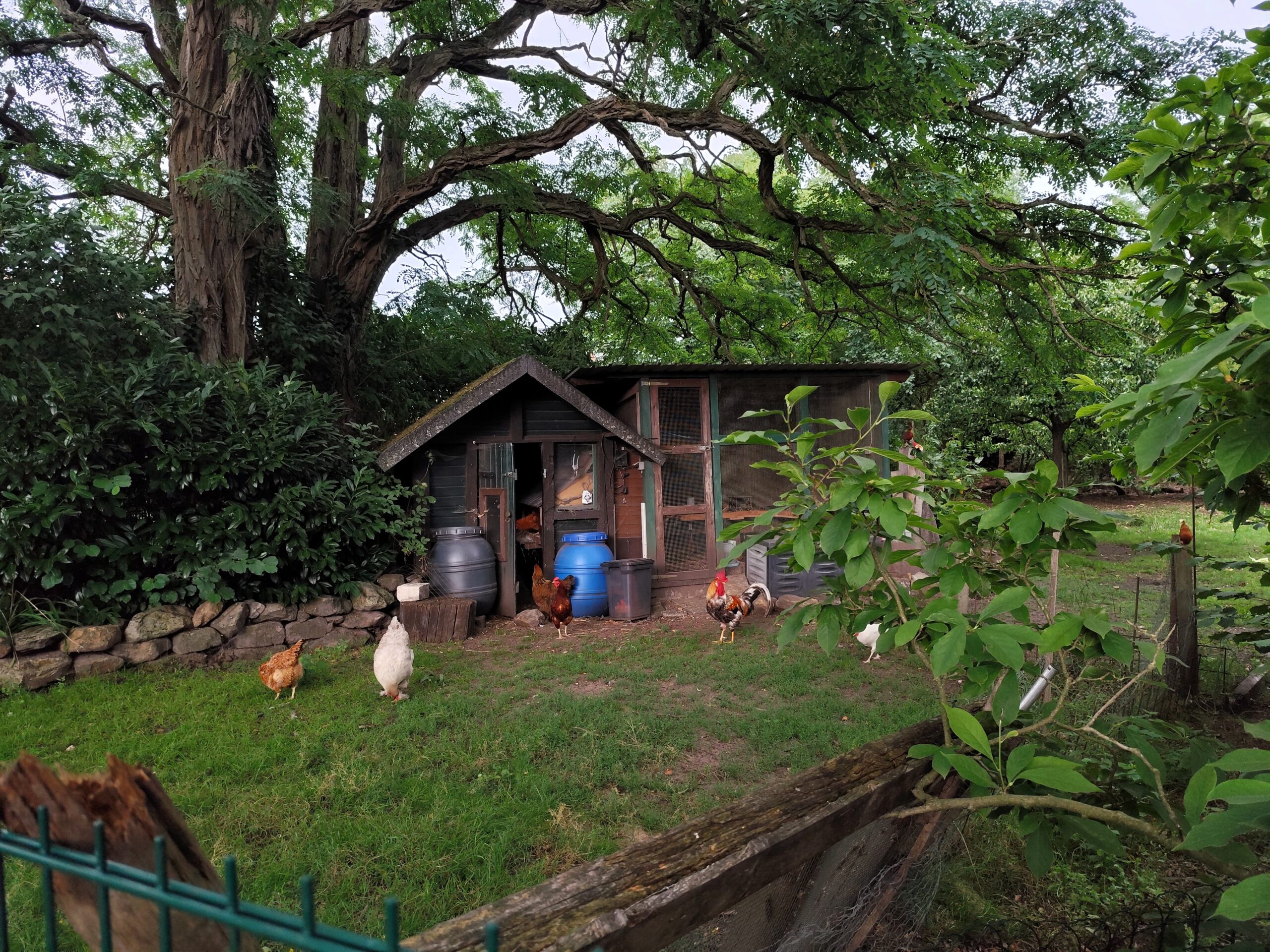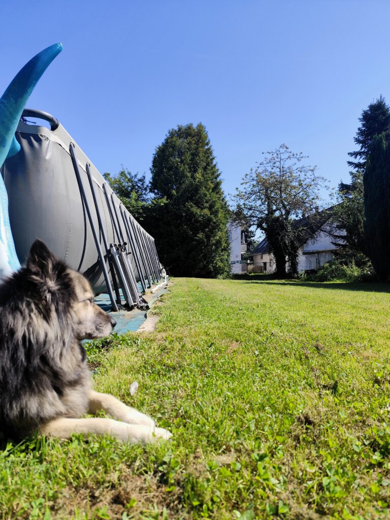Warum auch immer es so toll ist, vormittags Hasen und Traktoren zu beobachten, vielleicht gehört das zum Urlaub dazu? Gegen Nachmittag ist es zumindest Zeit weiterzureisen. Eine Gassi Runde bei Greven, weiter über Ostbevern, verlassen wir das Münsterland und nähern uns dem Teutoburger Wald. In einer kleinen Siedlung in Versmold erreichen wir unseren nächsten Spot. Neben dem großen Gehöft, welches nun das Wohnhaus unserer Gastgeber ist, befindet sich als Drive-In ein großer Garten mit Obstbäumen und Gemüsesträuchern. Und das Beste daran? Leinenfreiheit für mich! Alles ist eingezäunt und nebenan als Bonus mein Kino – ein Gehege mit Hühnern, Wachteln, Laufenten und der Hahn kräht munter los. Die frischen Eier genießen wir auf jeden Fall – welch ein Genuss! Ein kurzer Einkauf für den Grillabend und ich bekomme ein Hundebier sowie Feta Käse.
