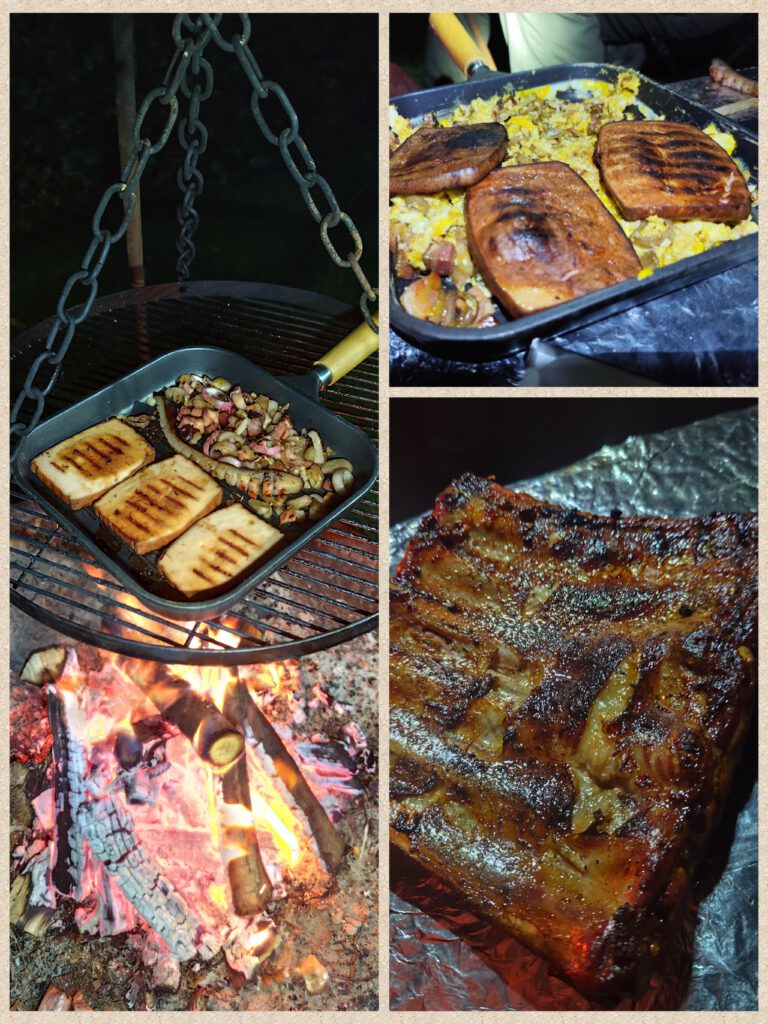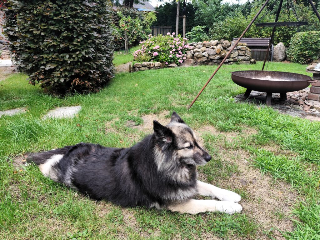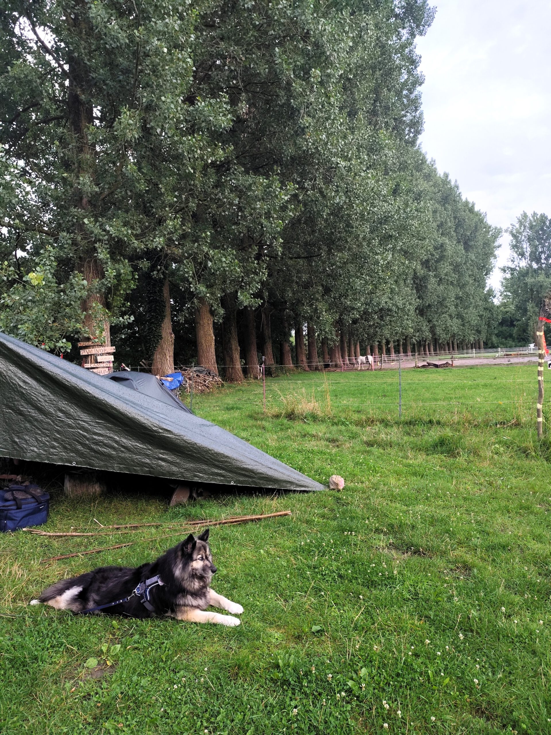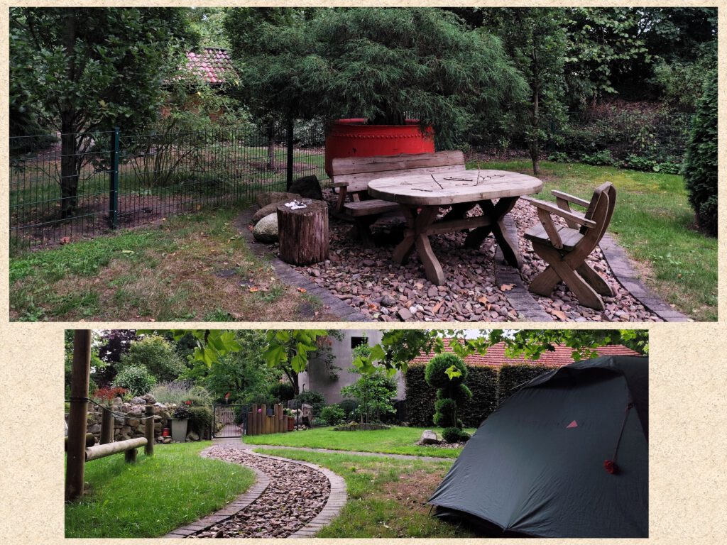 Das Wetter ist wechselhaft, darum ist es kein Wunder, wenn man mal länger schläft. Ein Huhn hat sich auf unser Platz verirrt, welch ein Spaß das einzufangen. Nachdem der Regen nachgelassen hat, machen wir uns auf dem Weg. Meine Leute wollen hier vor Ort beim Wiltmann Werksverkauf frische Fleisch- und Wurstwaren holen, super Tipp von den Gastgebern Vom Einkauf zurück, genieße ich es, im Garten frei umherzulaufen. Das Wetter spielt abends verrückt – Schauer, Zelt, Lagerfeuer und noch einmal Schauer, Shelter, Lagerfeuer. Na immerhin kommt der kulinarische Genuss hier nicht zu kurz – lecker Eier und für meine Leute zusätzlich äußerst köstliche Spareribs.