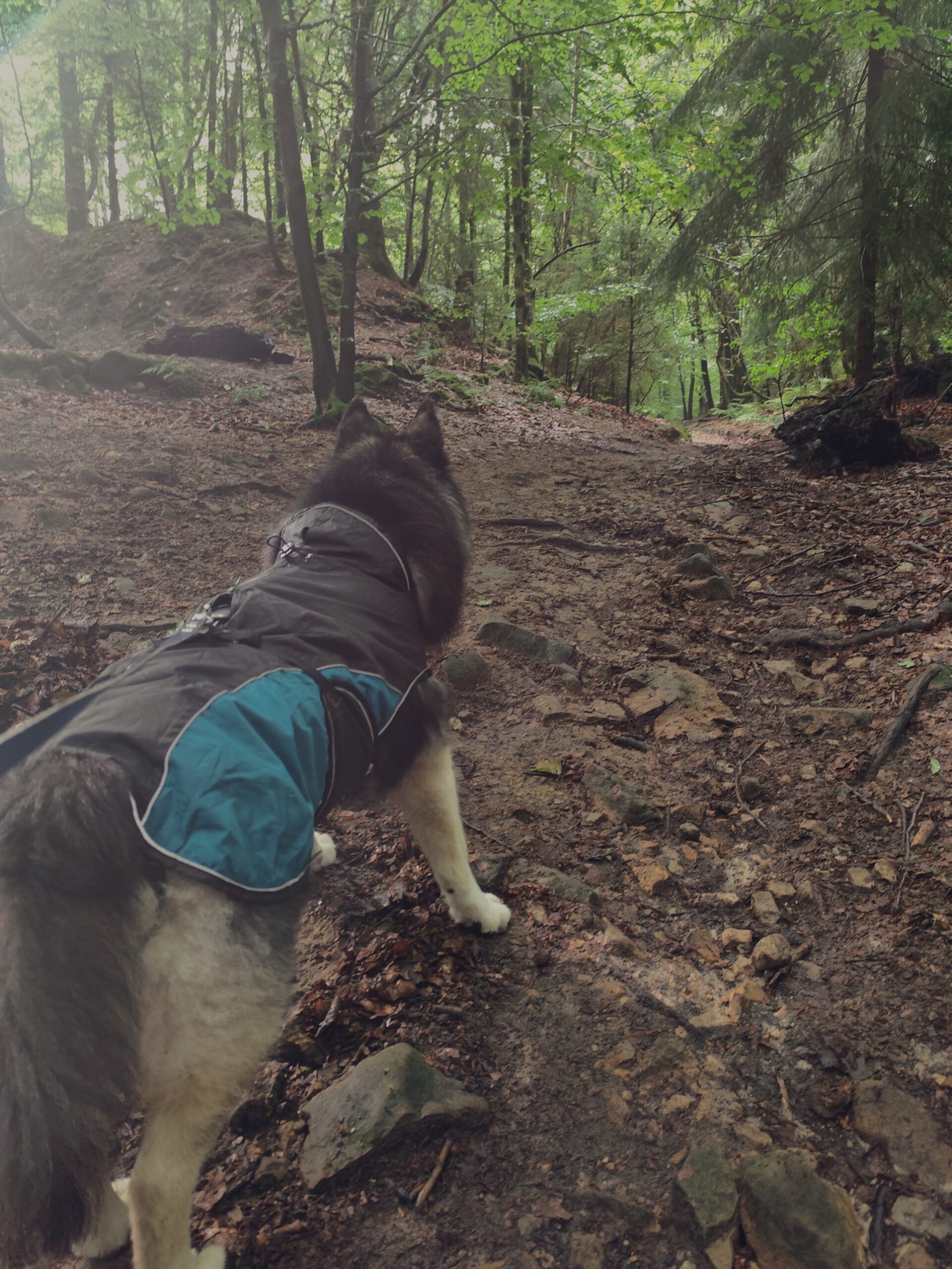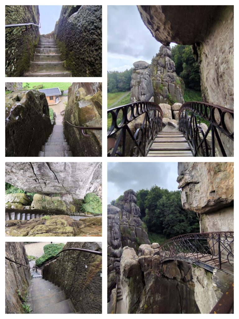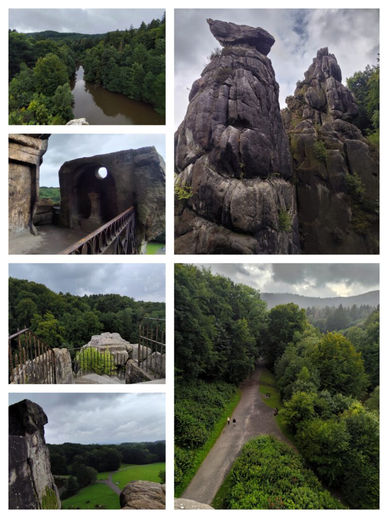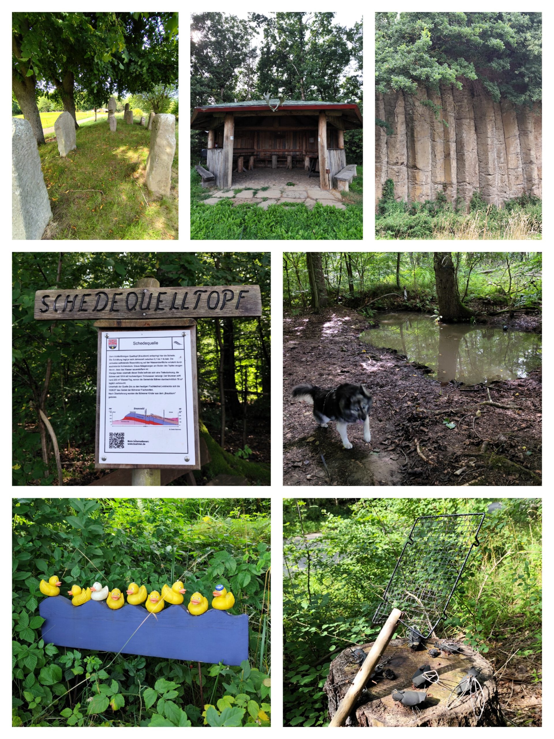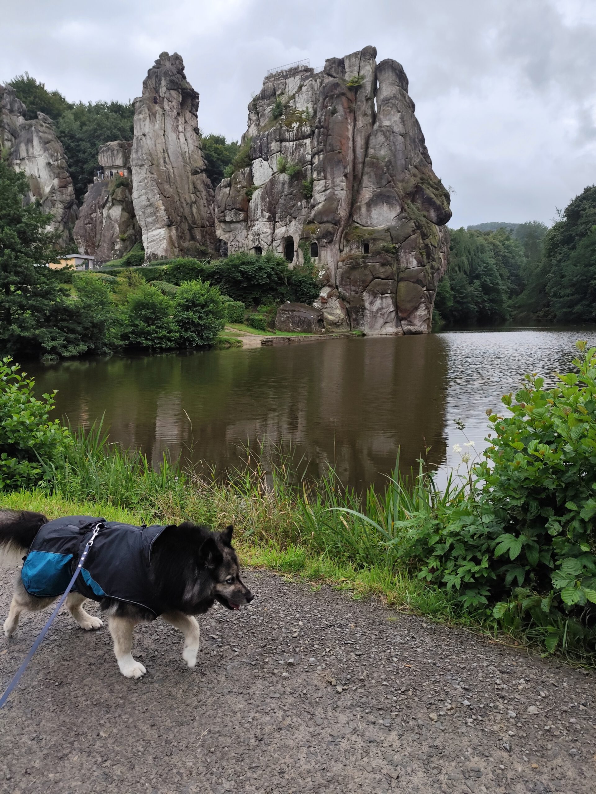 Nach der morgendlichen Gassi Runde und ausgiebiger Entspannung im Zelt, haben wir gegen Nachmittag endlich Glück. Die Regenschauer hören auf und wir gehen on Tour. Zusammen entdecken wir die Externsteine. Welch faszinierende Felsenformation und vielfältige Natur rundherum! Während Frauchen die Felsen erkundet über vielen steilen und teils glatten Stufen, bin ich froh, dass mir der Muskelkater erspart bleibt und mit Herrchen lieber eine Pause genieße. Auf dem Rückweg möchte ich im Wald das komische Pferd verfolgen, was sich wohl Esel nennt und dem Naturpfad folgt. Gute Idee, wir kommen am Alten Steinbruch beim Bärenstein vorbei, bis wir zurück am gleichnamigen Parkplatz sind. In Detmold wird Nachschub gekauft und der Abend am Lagerfeuer wird richtig gut, es hat sich doch gelohnt, für diesen Ausflug die Gegend hier zu besuchen.