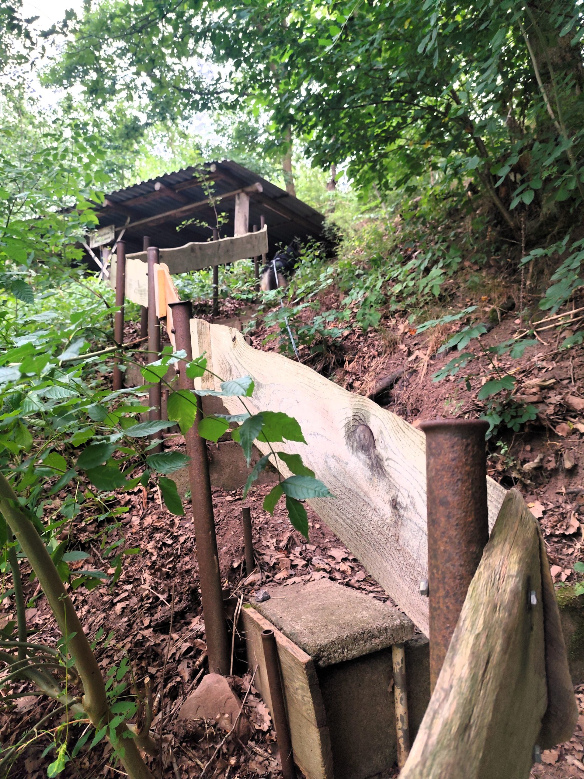 über den Rhein in Richtung Kandel (Pfalz), doch in der Tat verläuft die Strecke anders als letztes Jahr. Klingenmünster, weiter Ortsrand Kaiserslautern nach Wolfstein und dann bei Gerach, Nähe Idar-Oberstein, eine Pause für mich. Da blicke ich schon nicht mehr durch, gegen frühen Abend landen wir in Veldenz (Mosel). Das Camp ist auf einer schönen große Wiese direkt am Veldenzer Bach und hat einen großen offenen Unterstand. Perfekt, eine kleine Sandgrube erkläre ich sofort zu meinem Lieblingsplatz, mit Aussicht auf den Veldenzer Hausberg ist es ein gemütlicher Abend.
