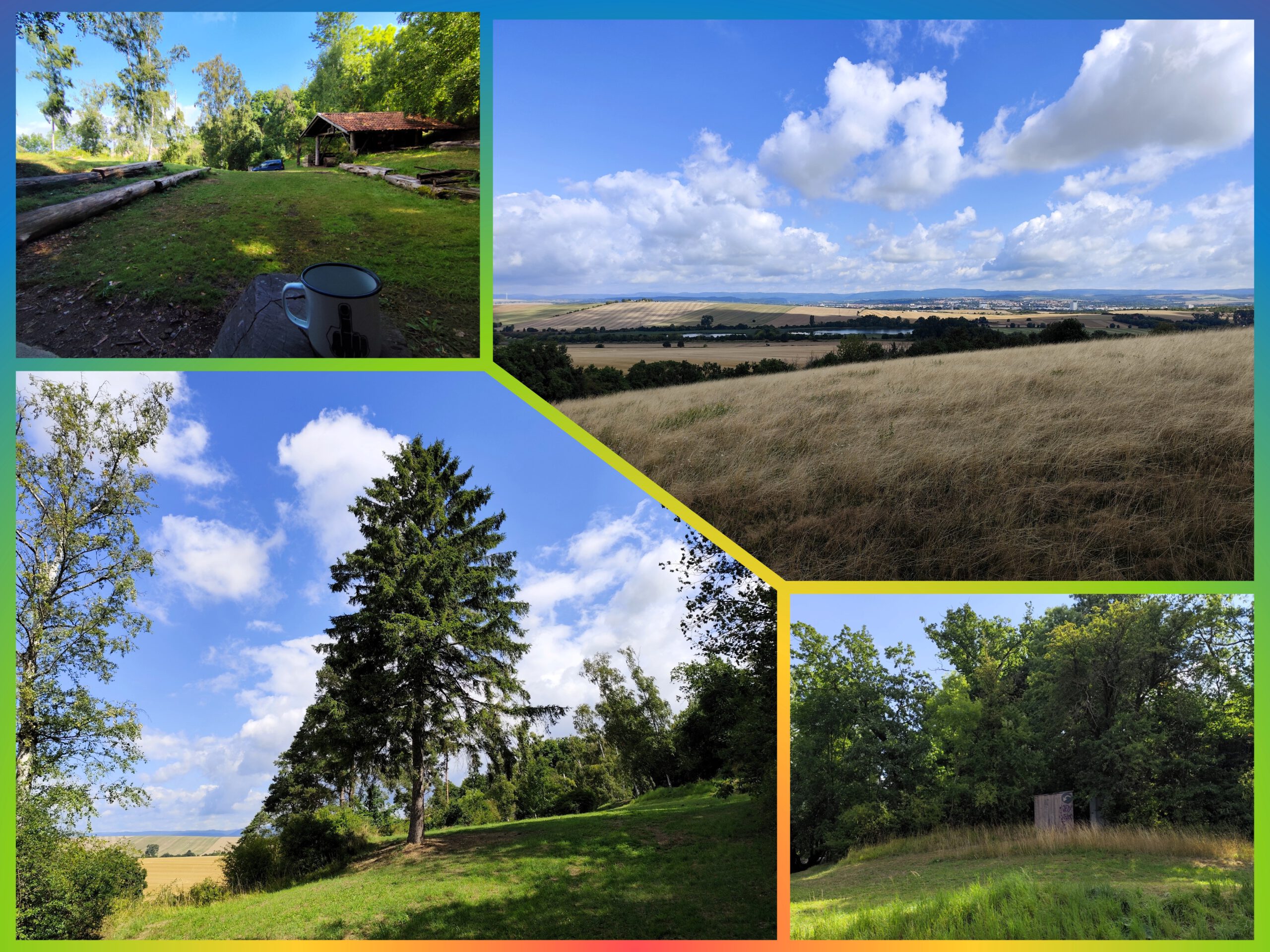 Wir verlassen NRW, erreichen über die Weser dann Niedersachsen. Wie ulkig, hier gibt es den Köterberg – der Köterberg liegt 500m üNN und ist somit der “Brocken” im Weserbergland. Die Rast erfolgt in Rhumspringe an einer der größten Quellen Europas – die Rhumequelle mit ihrer wunderschönen intensiven blaugrünen Farbe. Wir kühlen unsere Getränke dort, bevor wir weiterfahren und Thüringen erreichen. Nach Werther führt das Navi uns dummerweise über Feldweg, eine abenteuerliche Buckelpiste. Kurzer steiler Drive-In und Ankunft am Camp „Naturidylle im Südharz“ bei Steinbrücken, Nordhausen Wow! Da sind wir doch alle fassungslos, welch grandioses Plätzchen wir gebucht haben! Riesiges Gelände mit drei offenen Hütten, wenn man diese überhaupt noch so nennen darf, am Waldrand mit Aussicht auf Felder, Birken und Buchen – das ist echte Alleinlage außerhalb. Hier fühlen wir uns abends am Lagerfeuer alle richtig wohl.