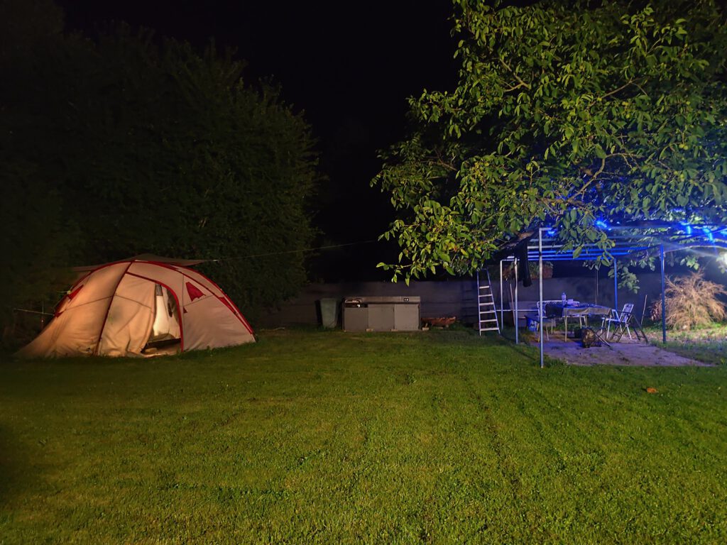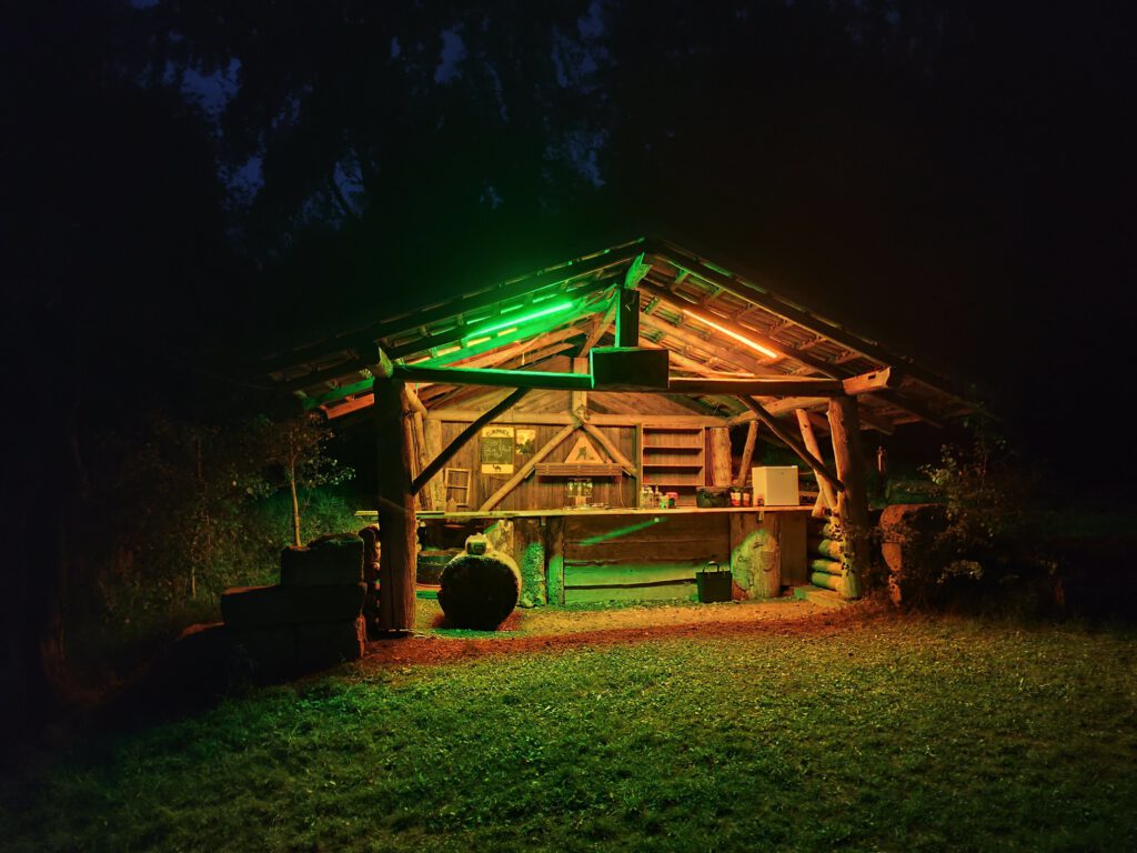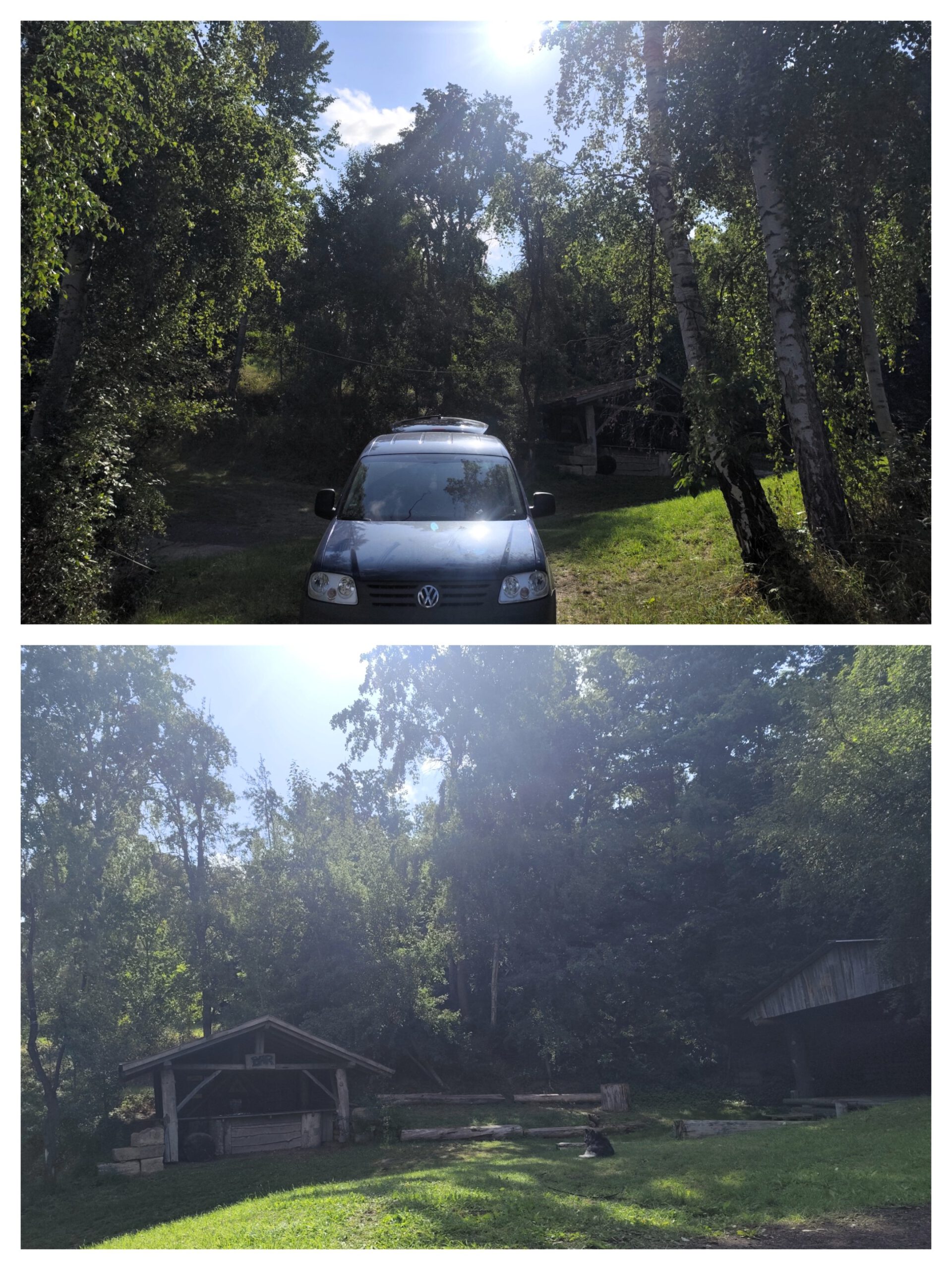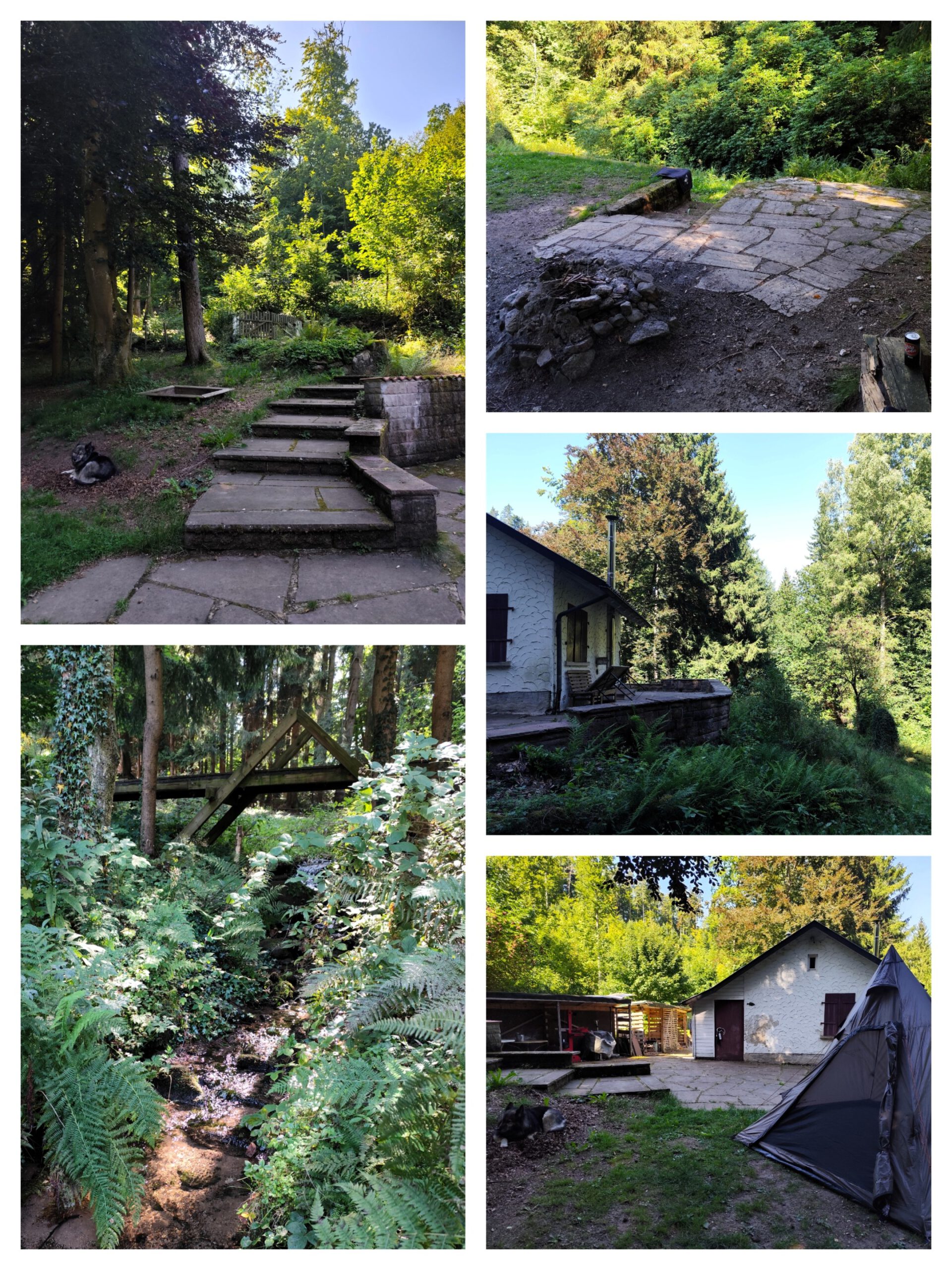 21 Grad, mehr heiter als wolkig, so lässt es sich doch perfekt in den Tag starten und auf der Wiese faulenzen. Frauchen braucht rund zwanzig Minuten nur um mal eben das gesamte Gelände zu erkunden. Irgendwie ist da was im Busch, denke wir haben alle den Wunsch, länger zu bleiben als wir es sonst auf unserem Roadtrip tun. Mal abwarten, was die planen. Nachmittags besuchen meine Leute den Schwiegervater unserer Gastgeberin in Steinbrücken, endlich ist das Geheimnis gelüftet. Wir zelten auf einem ehemaligen Festival Gelände, wo zu DDR Zeiten sogenannte Privatpartys stattfanden. Das erklärt die Magie, die dieser Platz im Wald hat. Noch eben direkt in Nordhausen einkaufen und am Camp zurück wird der Abend perfekt. Das Zelt auf der Bühne ist aufgeräumt, in der Bar Hütte läuft der Stromgenerator und dank neuen Mini Kühlschrank ist für kalte Getränke gesorgt. Die vorhandenen bunten Leuchtröhren funktionieren und machen gute Laune. Wetter ist top, genug Holz für Lagerfeuer und die Bratwurst sowie Feta Käse zum Nachtisch schmecken mir – alles astrein!
