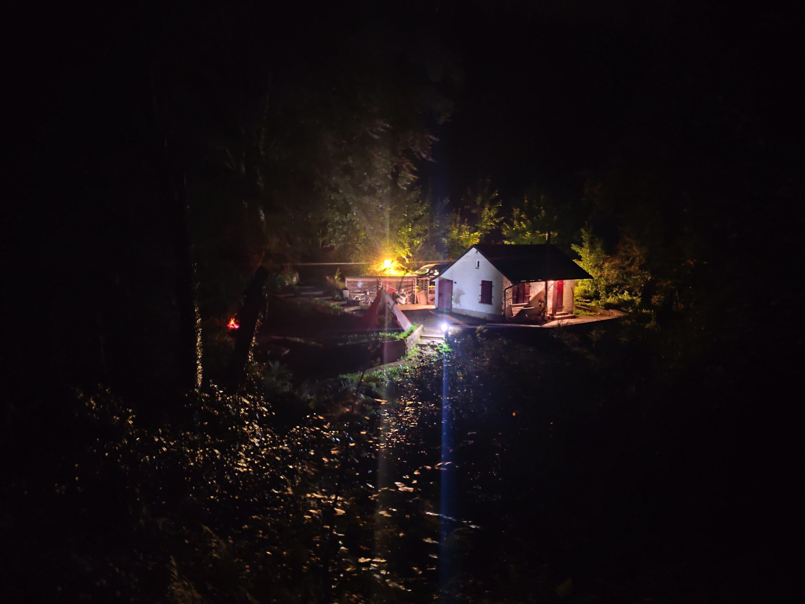 Am nächsten Morgen entwische ich früher aus dem Zelt und mache es mir im Holzschott bequem. Die Sonne zieht um die Berggipfel herum, mittags scheint sie bei 28 Grad auf den Platz. Auch ein Graureiher besucht uns und landet im Bach. Herrlich, den lieben langen Tag einfach nur faulenzen und die Stille genießen. Abends gehen wir kurz eine Runde laufen, um abschließend die letzte Nacht mit lecker gegrillten Steaks zu krönen, wobei ich diese ja roh bevorzuge. Ein letzter Blick auf den Sternenhimmel, der hier weit außerhalb atemberaubend ist, bevor der Urlaub am nächsten Tag zu Ende geht und wir nach Hause fahren. Auf Wiedersehen, Gaisbachtal!